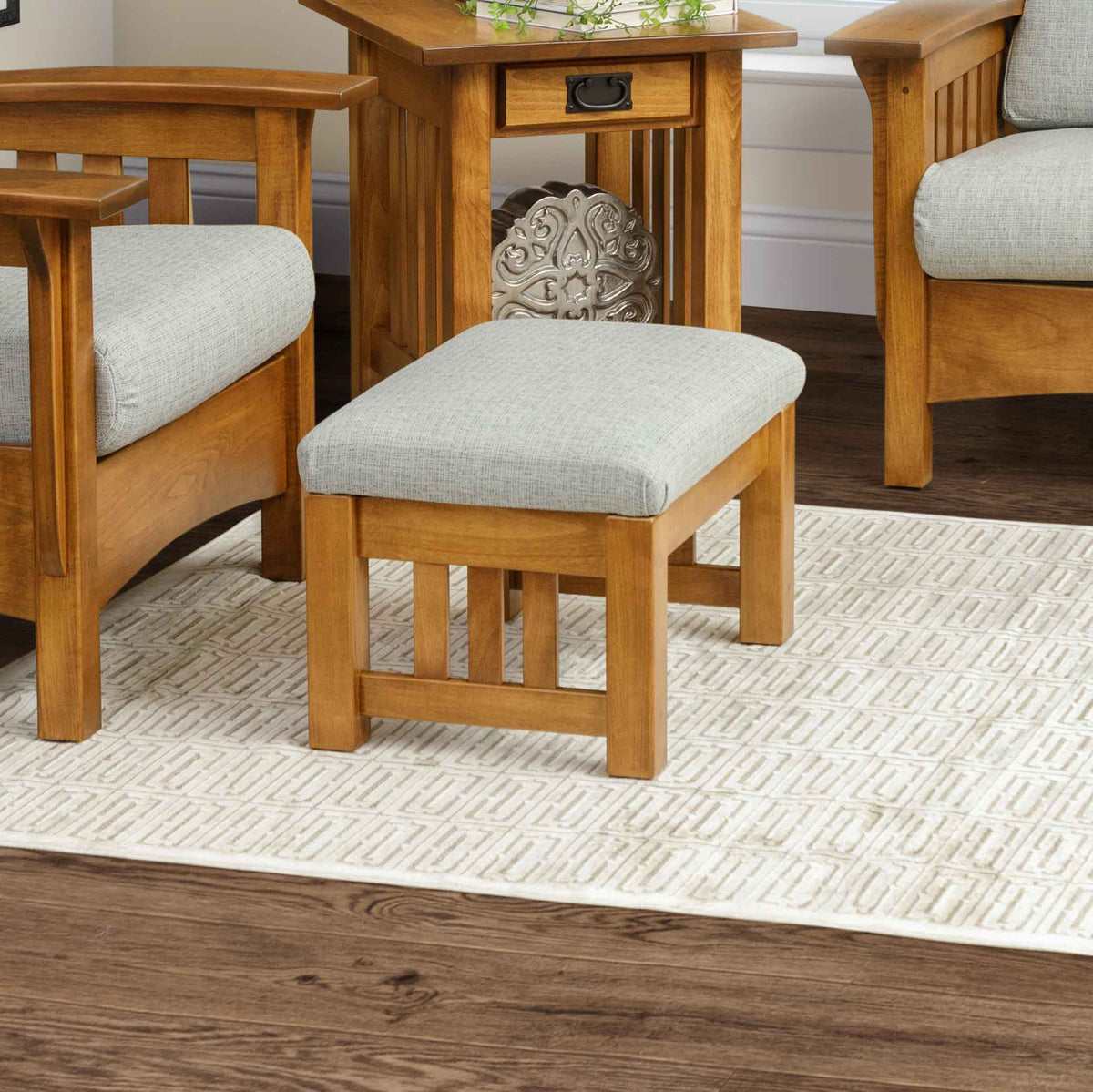Amish Classic Mission Wood Frame Ottoman - An upholstered Ottoman built to last. Amish Handcrafted in Lancaster County Pick your wood, stain & finish options Available in Oak, Maple, Cherry & Quartersawn White Oak. Amish Backed Warranty Water Resistant Finish View Stain & Finish OptionsView Fabric Options