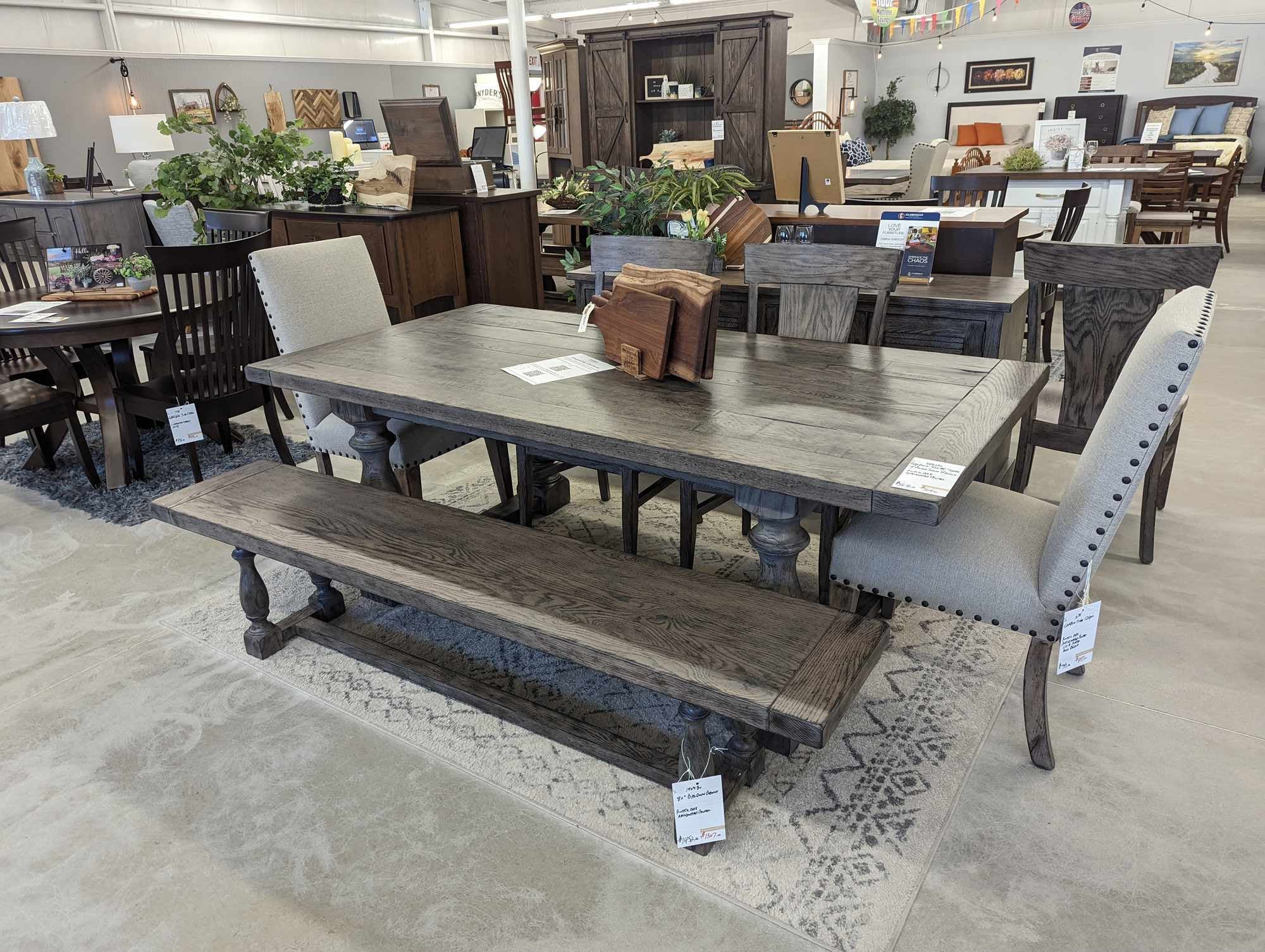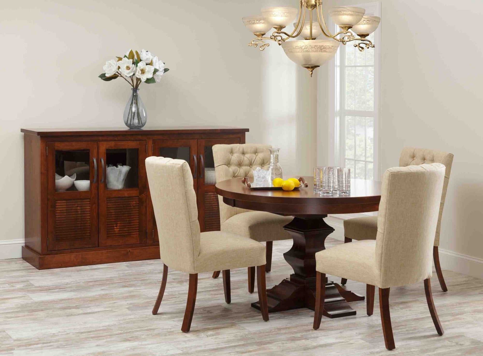 Here is modern farmhouse style, steeped in character with large turnings balanced with simple, functional lines on the chairs. The louvered doors on the hutch buffet and servers give a touch of vintage class.