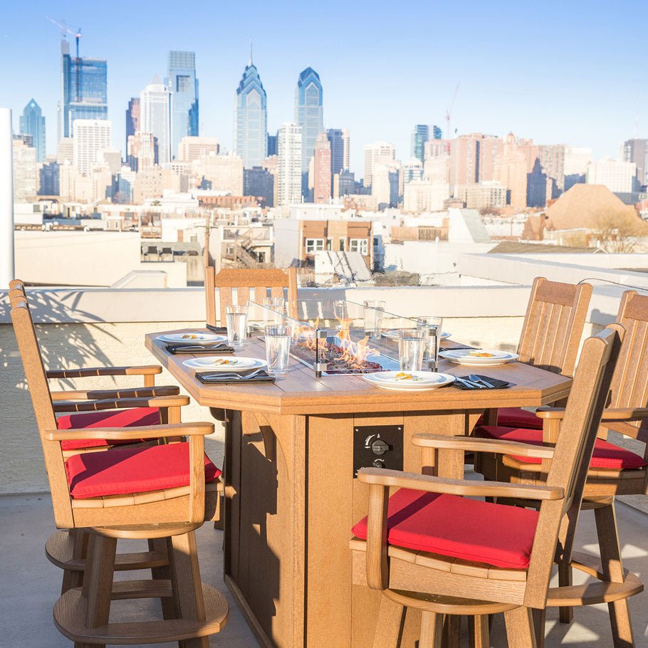 Amish High End Patio Fire Tables | Nationwide Shipping - Shop our exclusive collection of high end Amish made fire tables handcrafted out of durable and long lasting poly lumbar. Featuring a lifetime warranty. We offer dining, counter, and bar height fire tables in either square, round, or rectangular as well as fire pits.