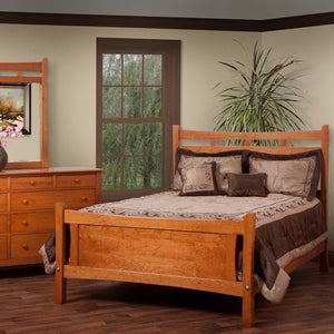 Amish New Transitions Panel Bed - The New Transitions Panel Bed is a stylish addition to our offerings. The gently curved legs and solid panels give a modern yet simple look. Often shown in light cherry with wood knobs, you can also do it in a grey Maple for a more modern look. Available in Twin, Full, Queen, King. Handcrafted in Pennsylvania out of Oa