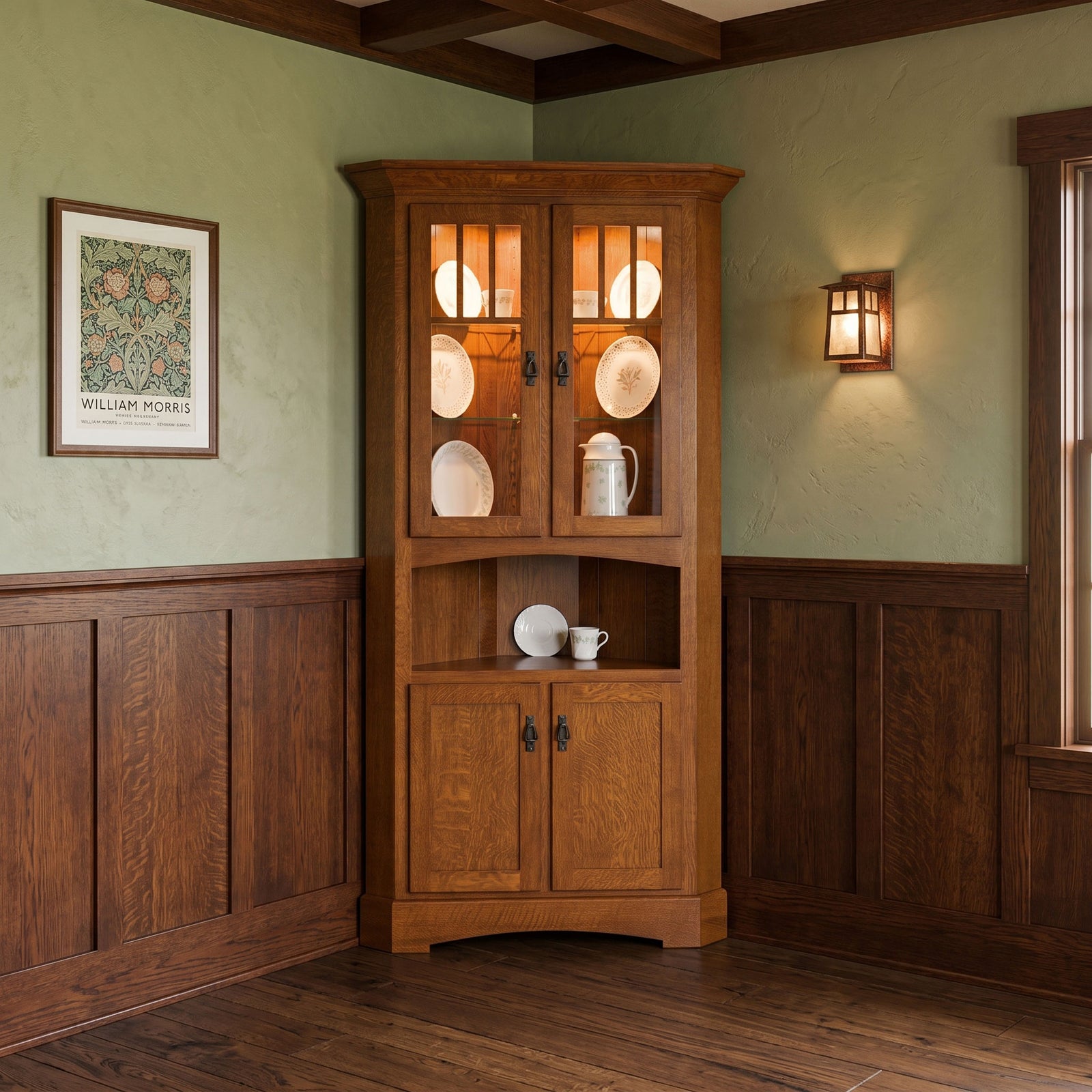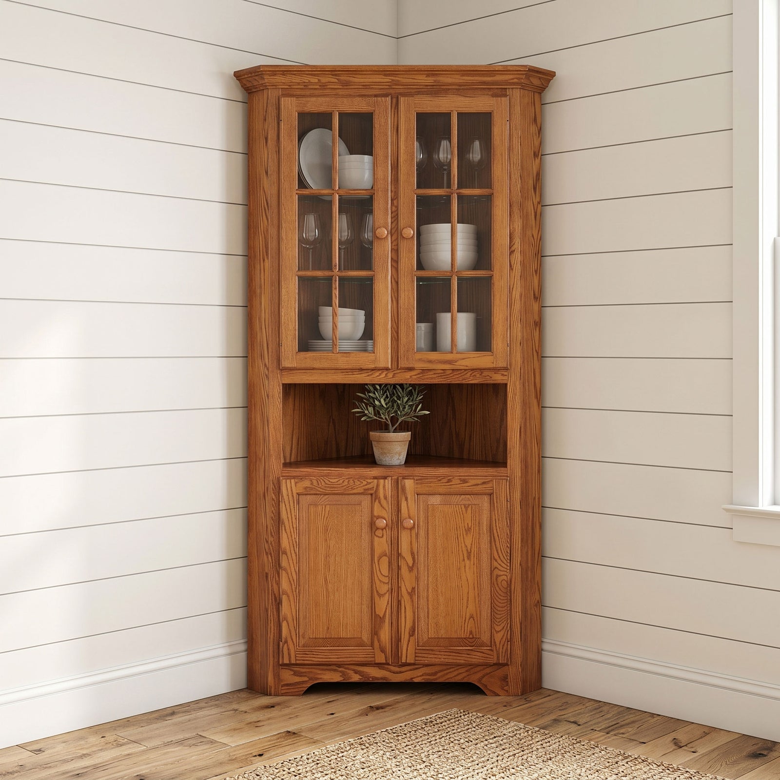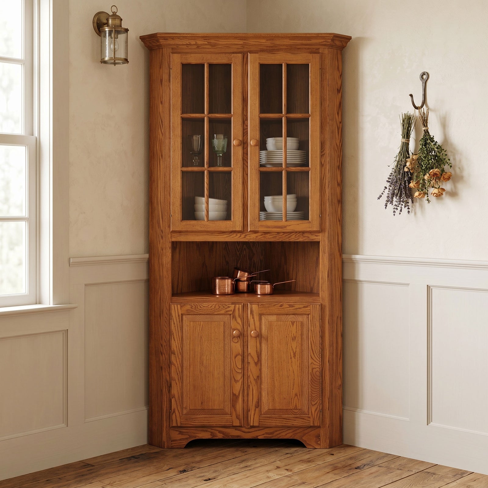 A solid-wood corner china hutch adds both warmth and function to your dining room or kitchen. Amish-made corner hutches help you make use of unused space and provide a beautiful place to showcase your favorite dishes, glassware, or family heirlooms. Each hutch is handcrafted by skilled Lancaster County artisans from oak, cherry, or maple, using dovetail joinery and hand-rubbed finishes that look even better as they age. Whether you want a compact corner cabinet or a tall hutch with glass doors, this furniture works with traditional, farmhouse, or modern styles. Click any hutch in the collection to see your options and follow the steps to personalize and order the right piece for your home.