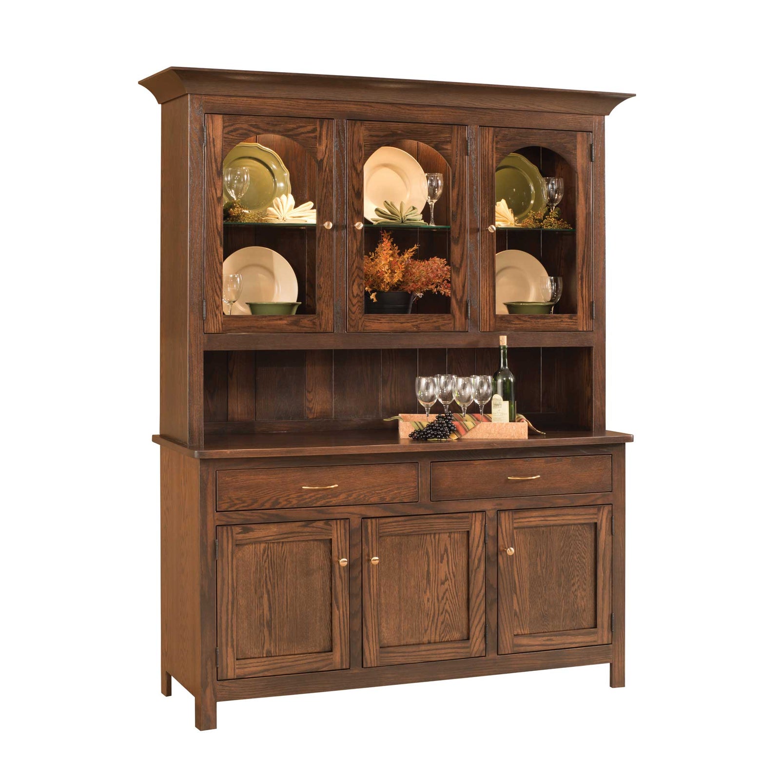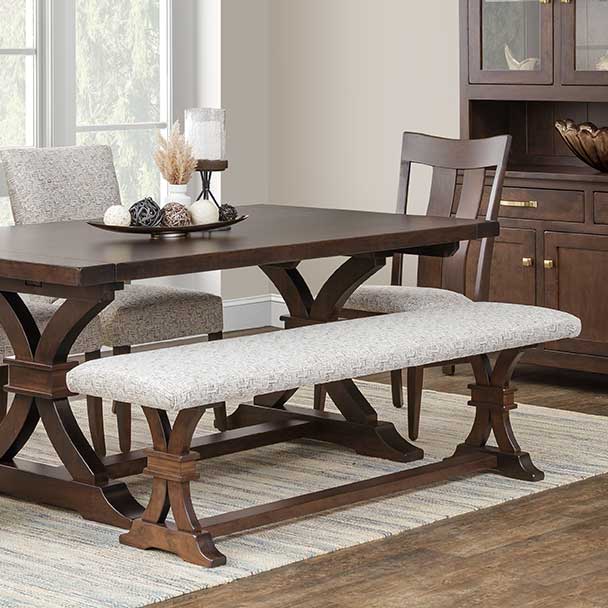 Sherwood Amish Trestle Table Dining Room Set - New for 2022 the Amish Made Sherwood table and bench. Shown in Aged Cocoa on Sap Cherry. Solid Top or Extendable with table Leaves. Shown w/ Optional Upholstered Seat in C29-6 Social Fabric. Shown with the Georgetown Hutch.