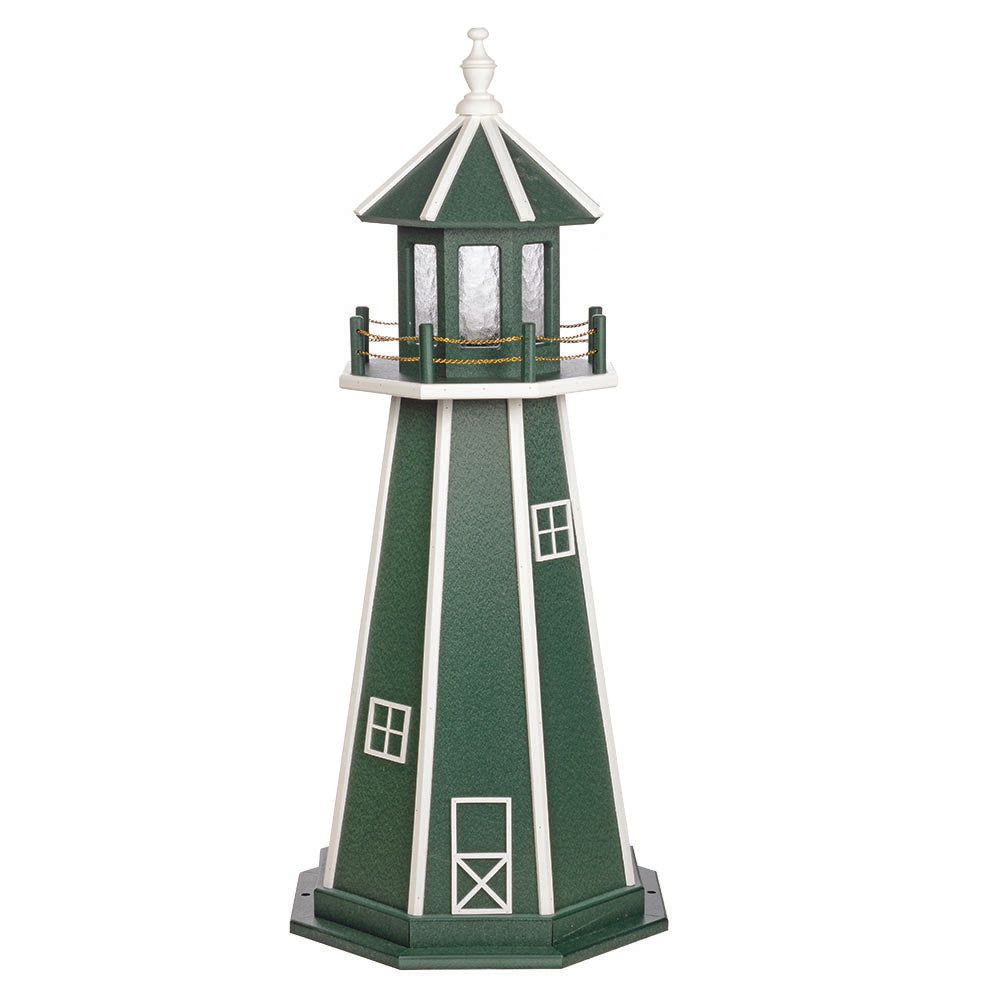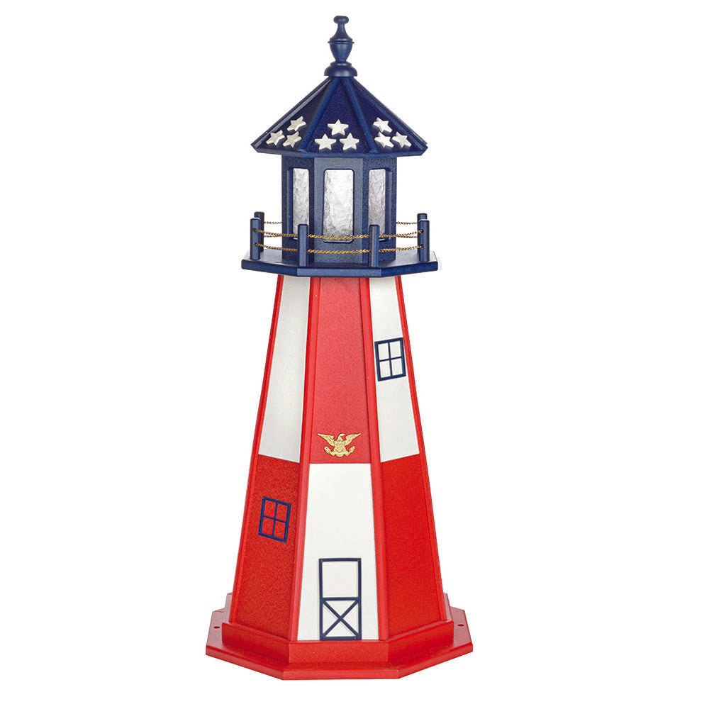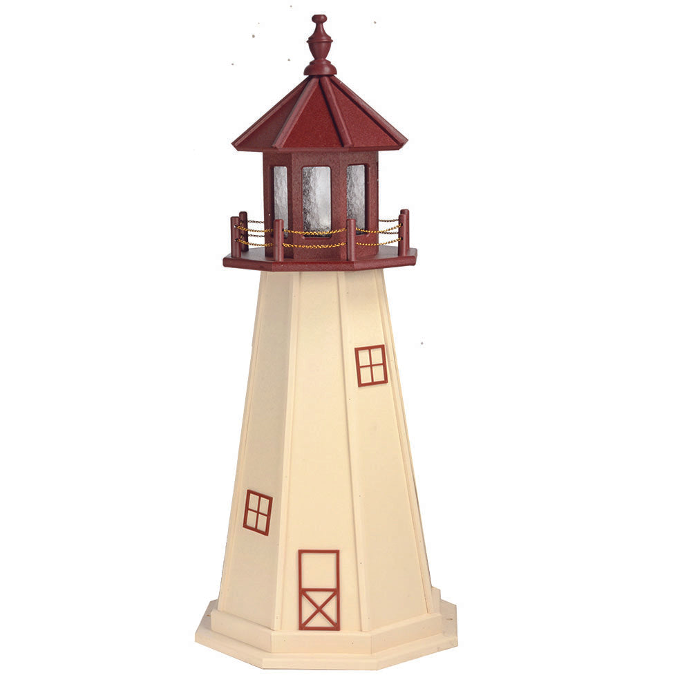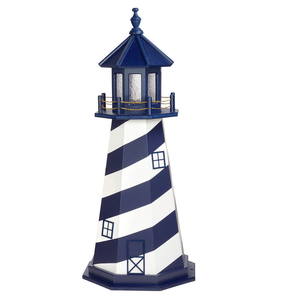 Amish 4' Wood Outdoor Decorative Lighthouse - Where it's Made: Lancaster, PAWhat it's Made Of: PolyShipping: Ships to all the lower 48 states!Assembly: Comes fully assembledExterior Size: 20"W x 48"H Interior Size: 15"W x 29"H (8"W at 2' High)