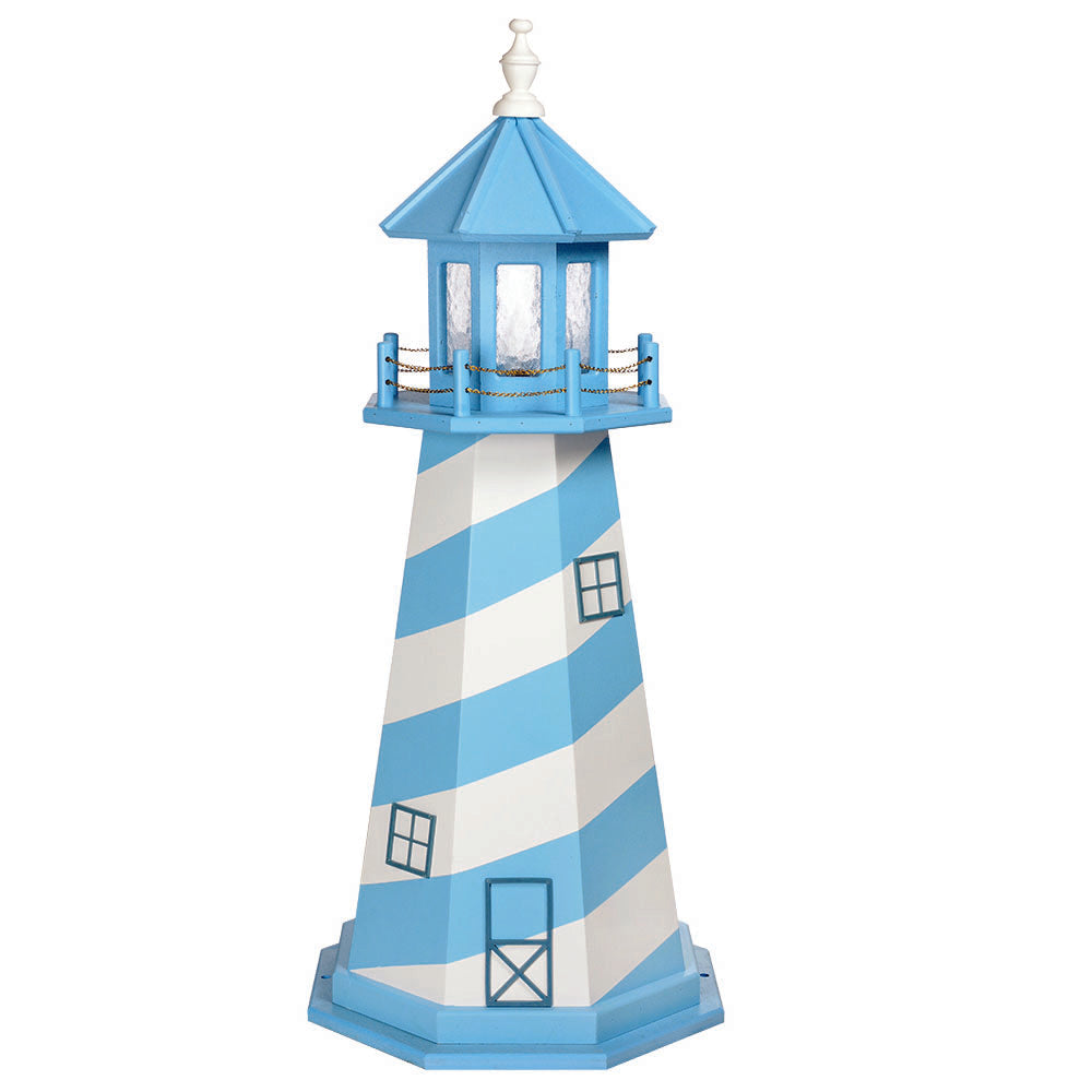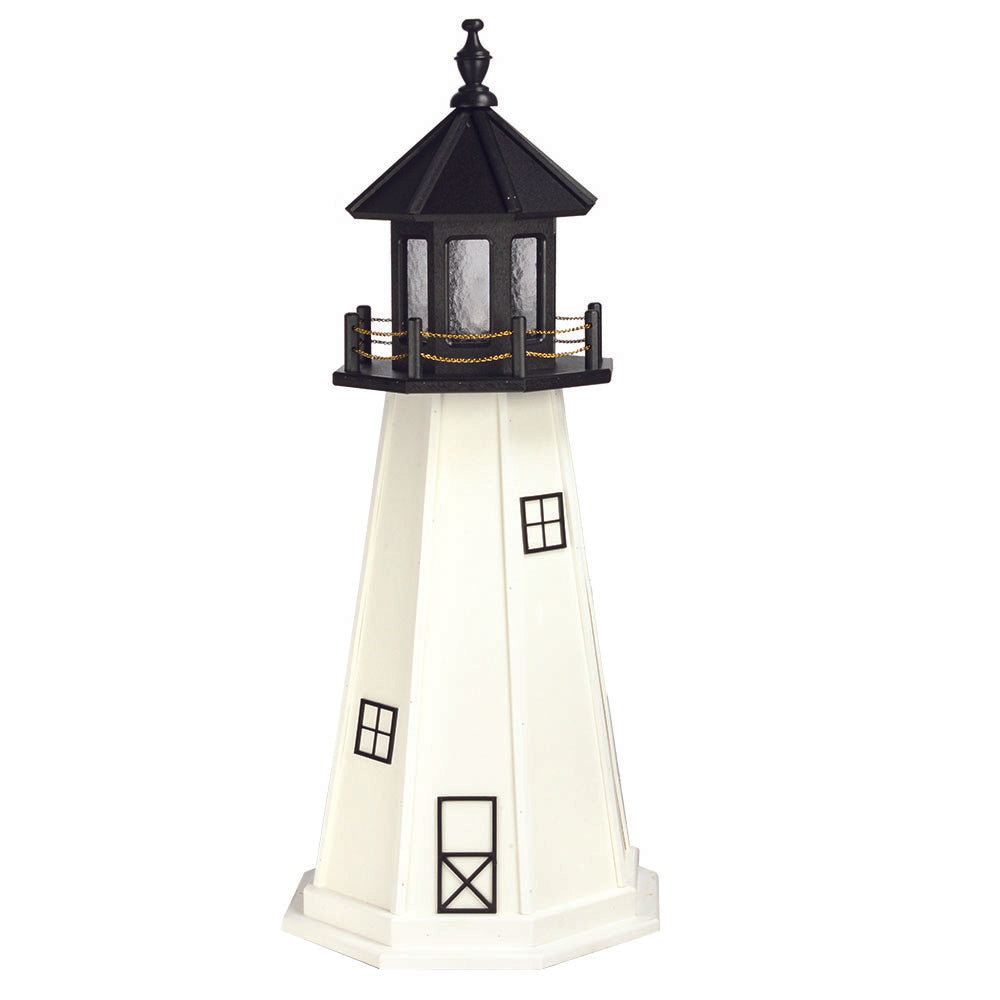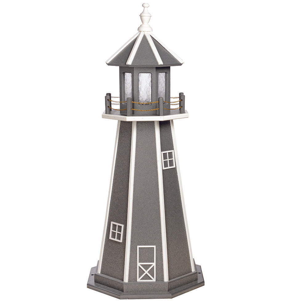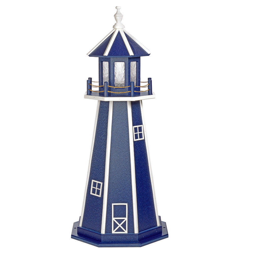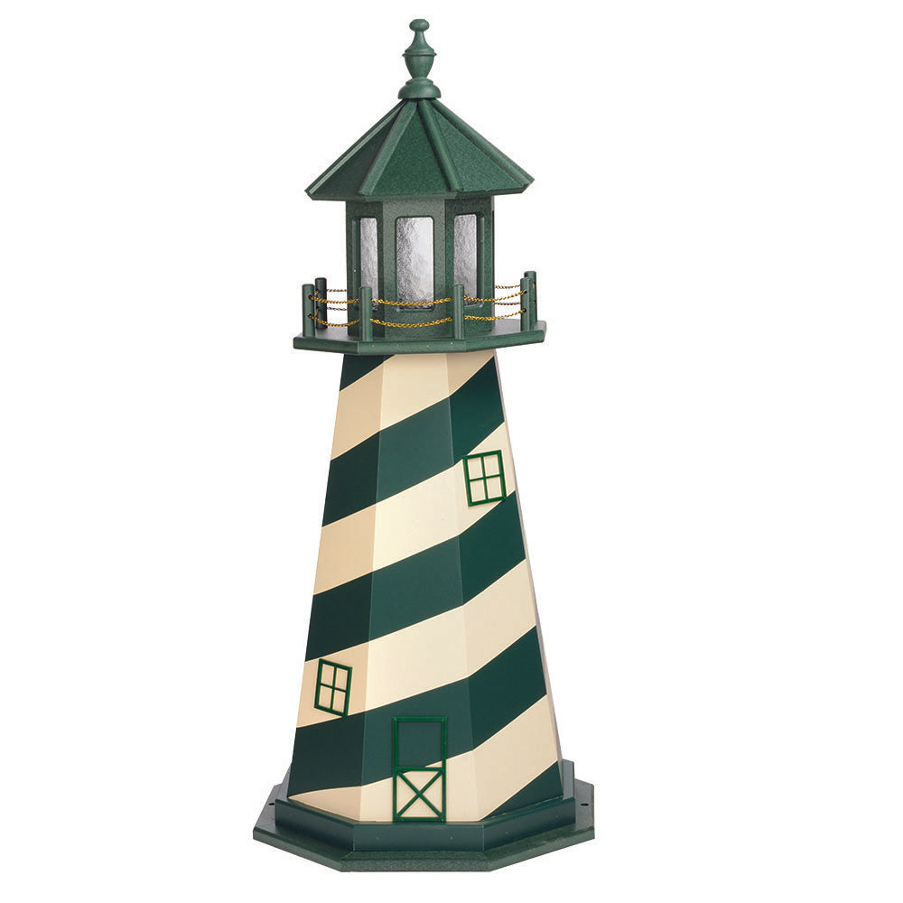 Amish 4' Wood Outdoor Decorative Lighthouse - Where it's Made: Lancaster, PAWhat it's Made Of: PolyShipping: Ships to all the lower 48 states!Assembly: Comes fully assembledExterior Size: 20"W x 48"H Interior Size: 15"W x 29"H (8"W at 2' High)