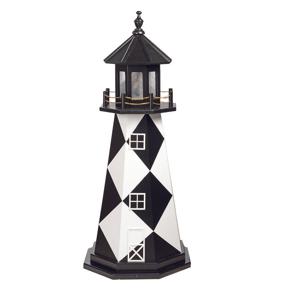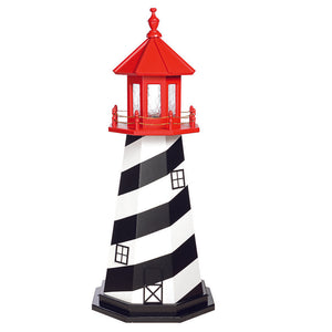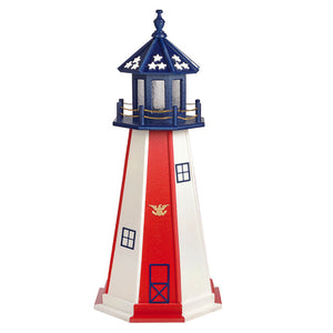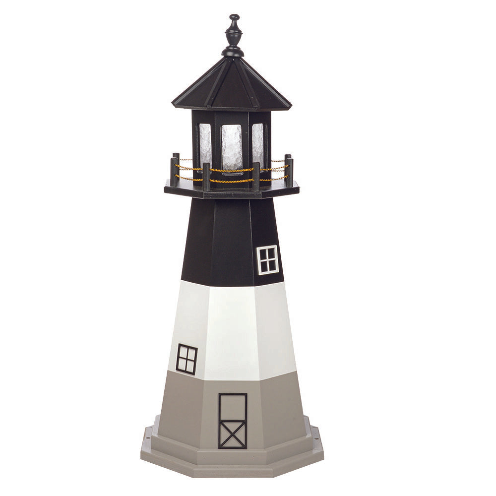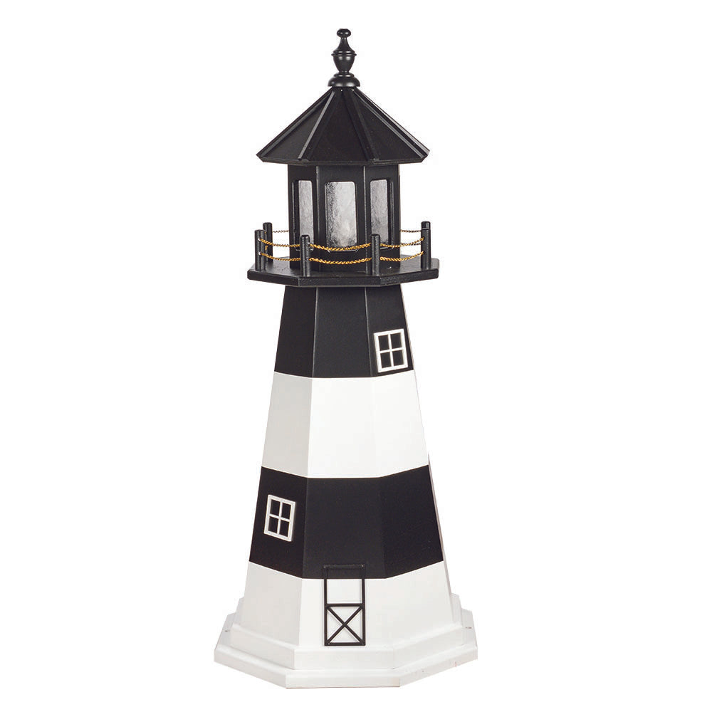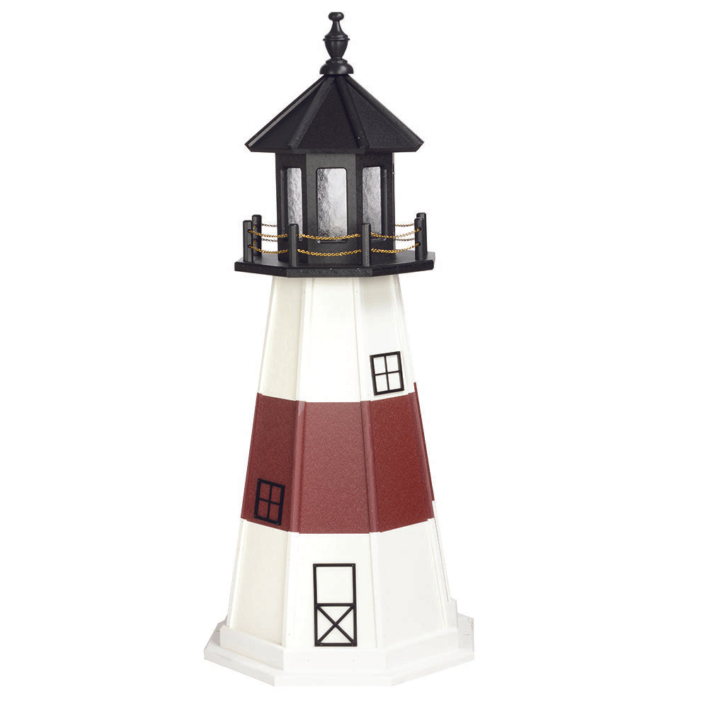Amish 4' Wood Outdoor Decorative Lighthouse - Where it's Made: Lancaster, PAWhat it's Made Of: PolyShipping: Ships to all the lower 48 states!Assembly: Comes fully assembledExterior Size: 20"W x 48"H Interior Size: 15"W x 29"H (8"W at 2' High)