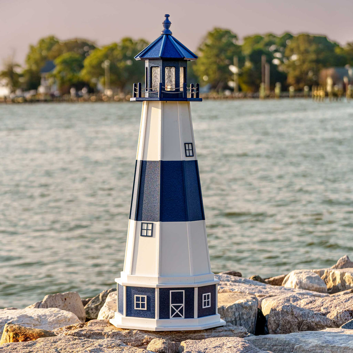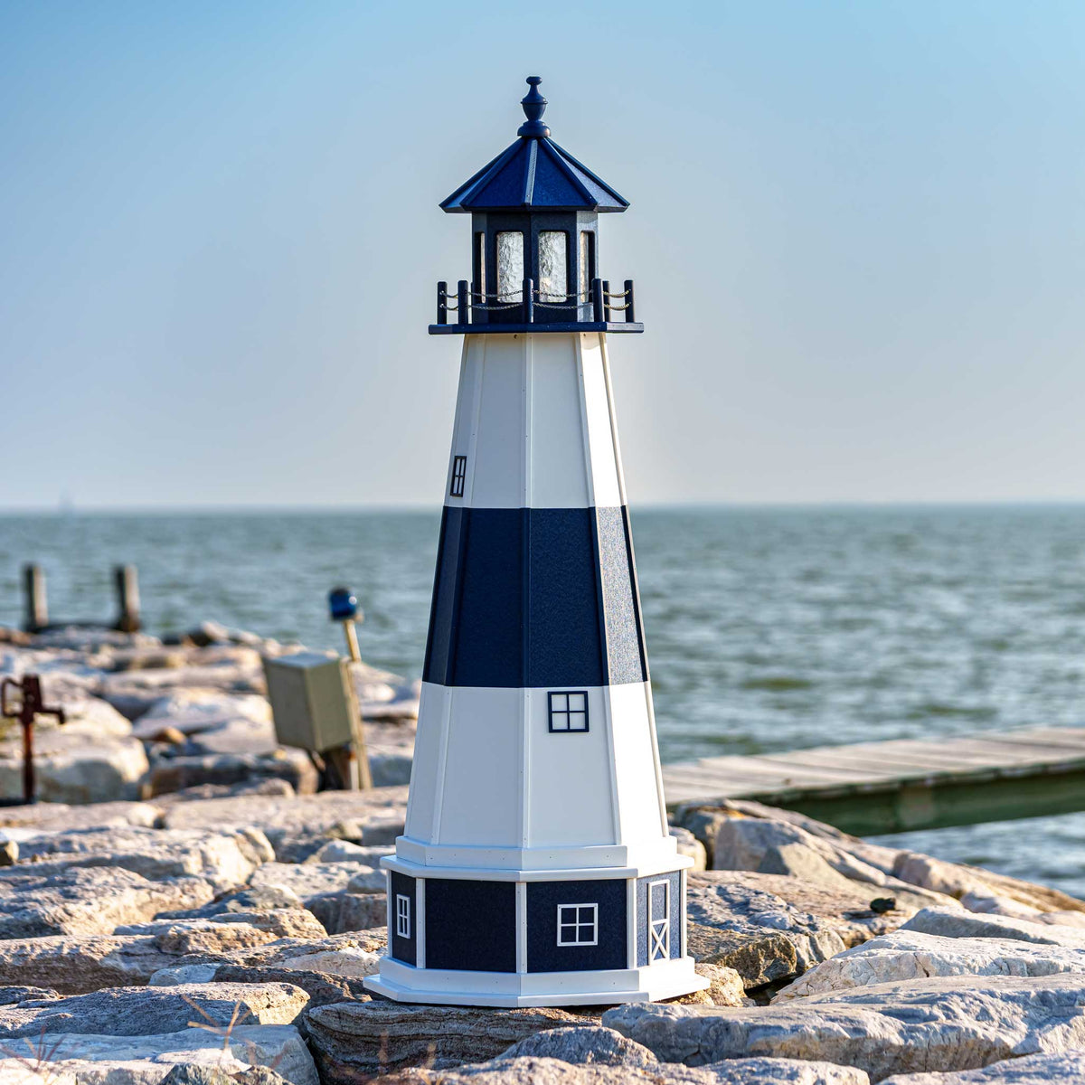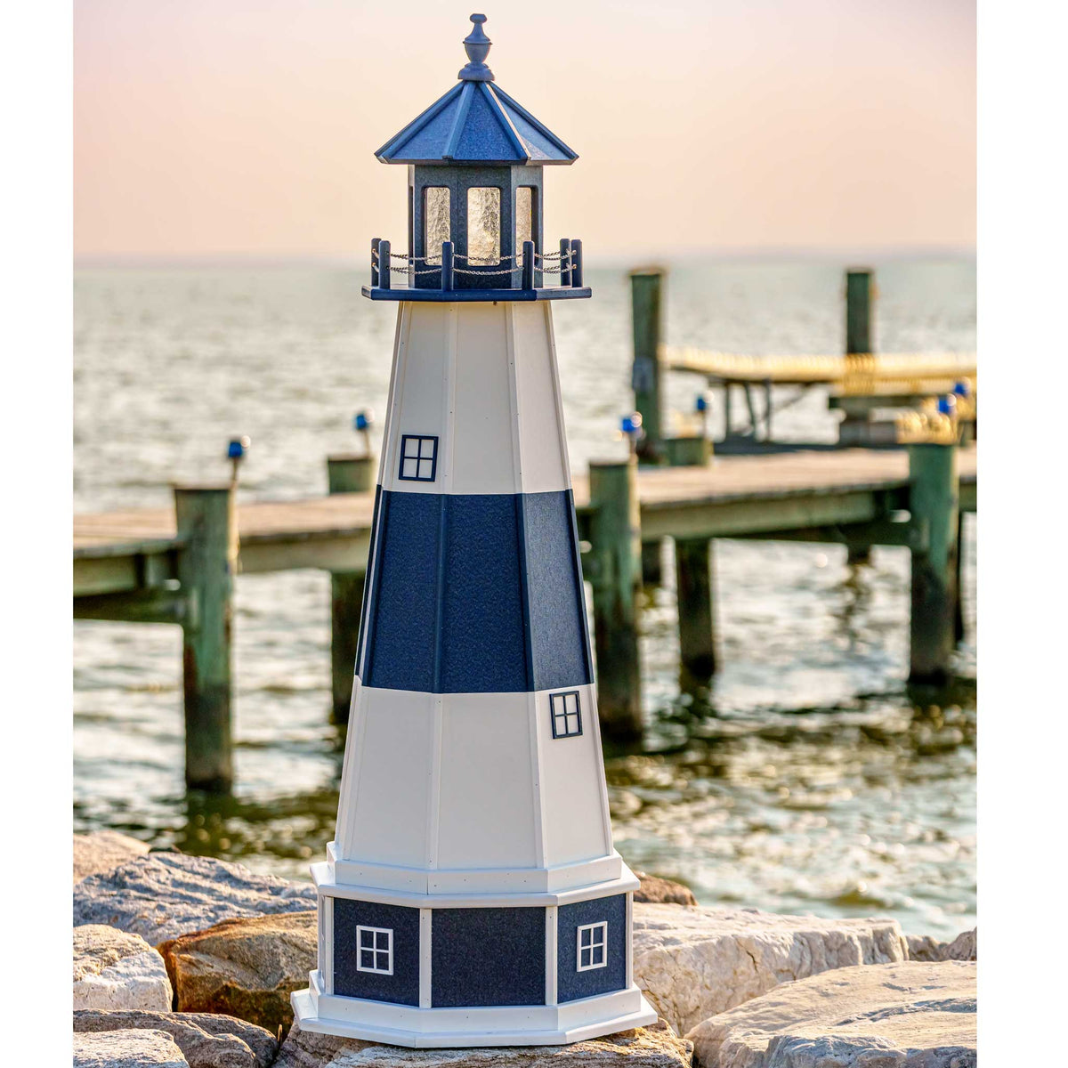 Amish 5' Poly Outdoor Decorative Lighthouse with base - Where it's Made: Lancaster, PAWhat it's Made Of: PolyShipping: Ships to all the lower 48 states!Assembly: Comes fully assembledExterior Size: 22"W x 60"H Interior Size: 16"W x 39"H (11"W at 2' High)Base Size: 24"W x 10"H (Overall 5'7"H)