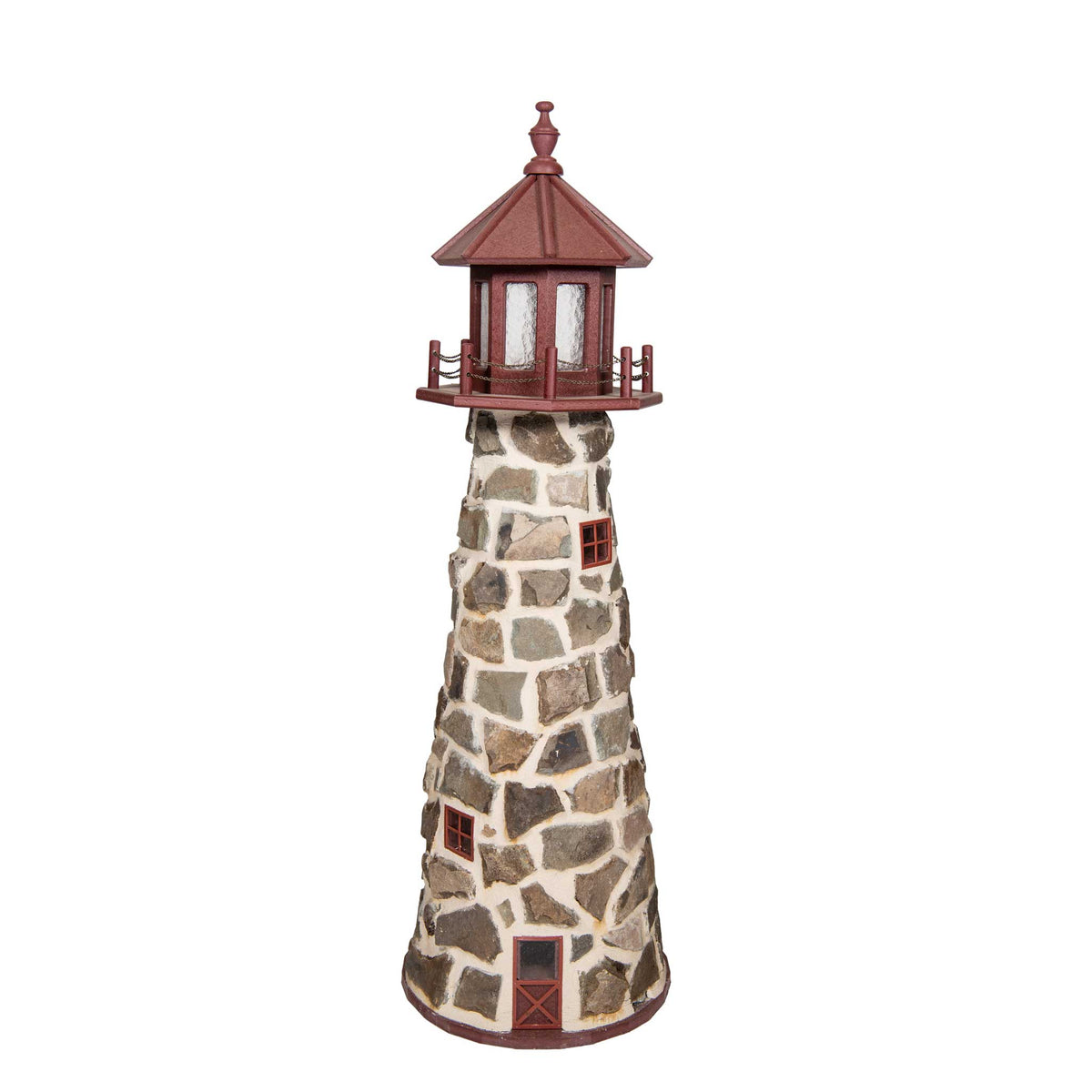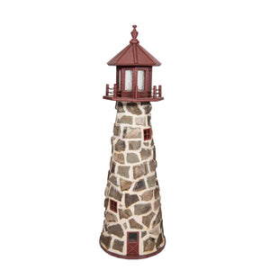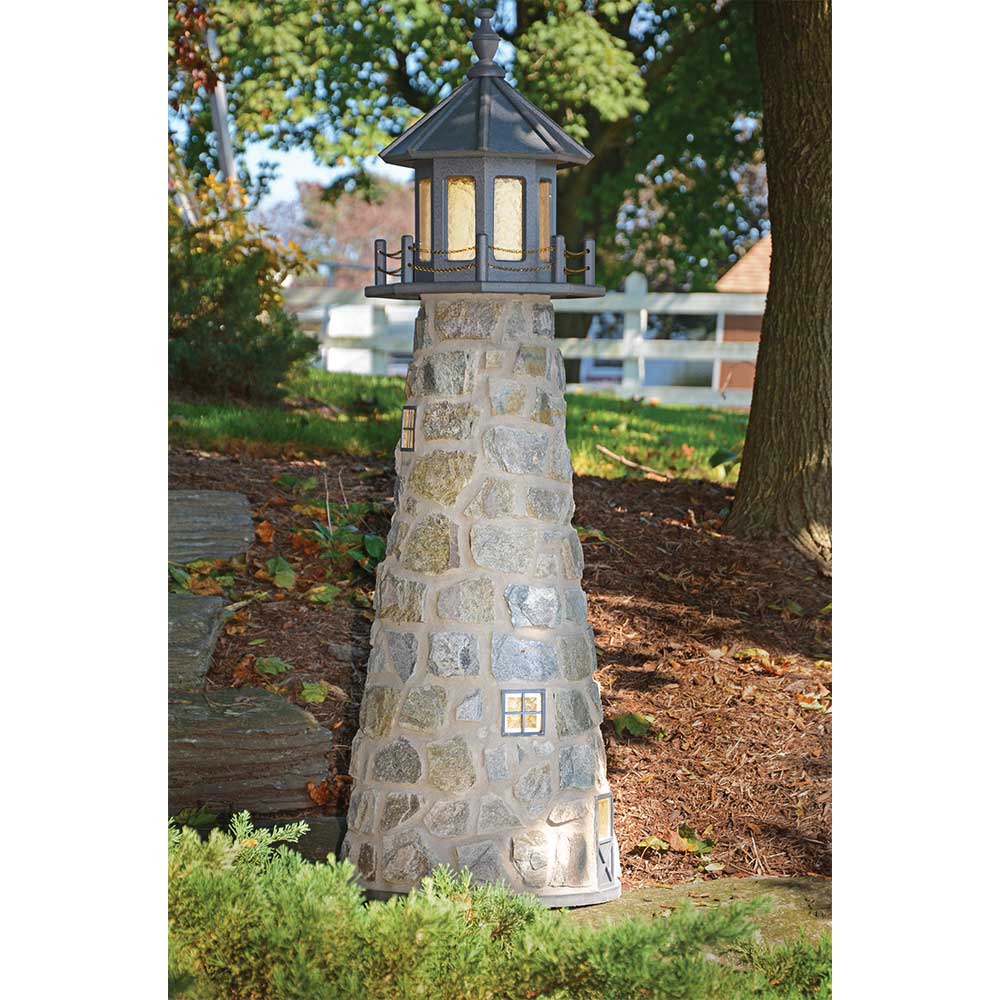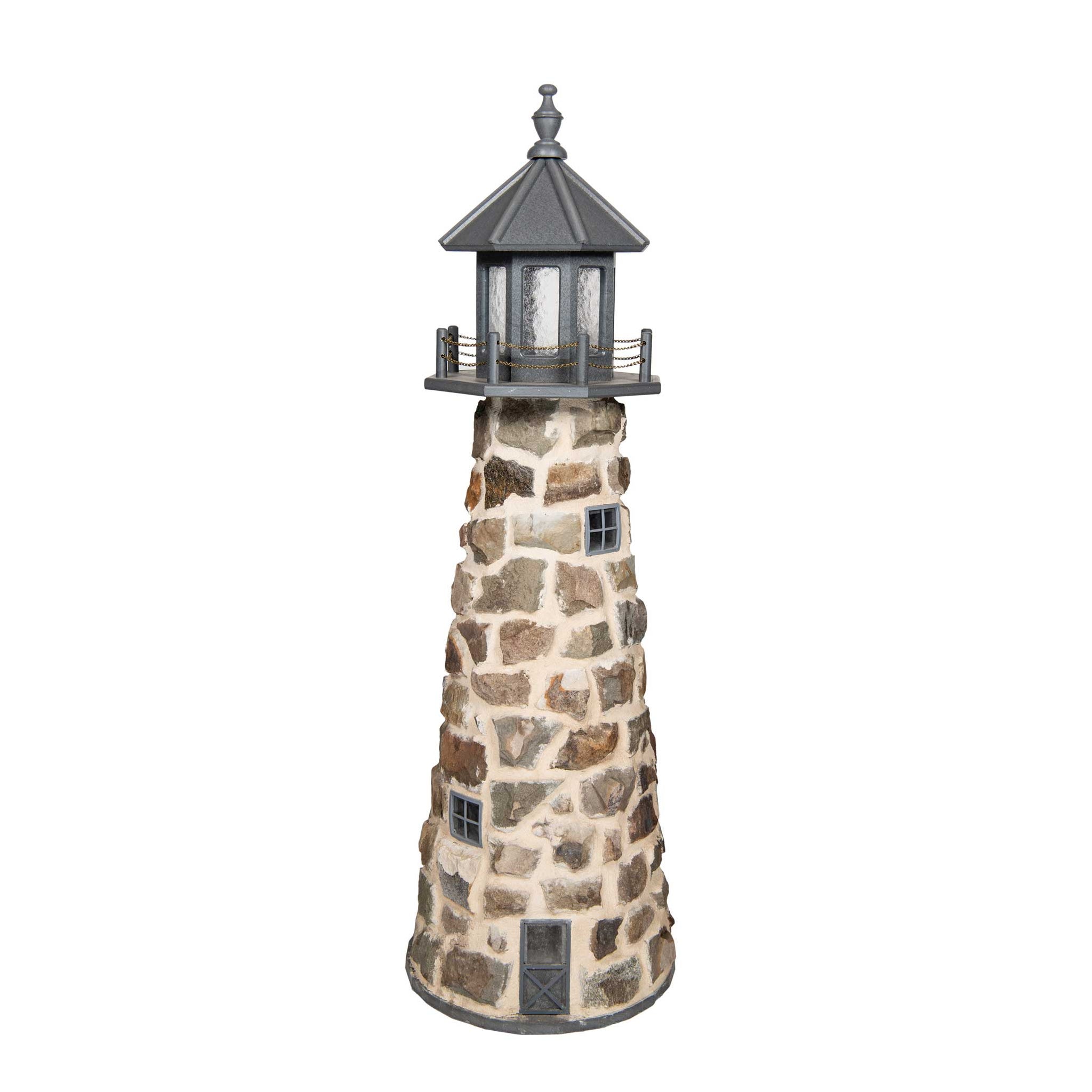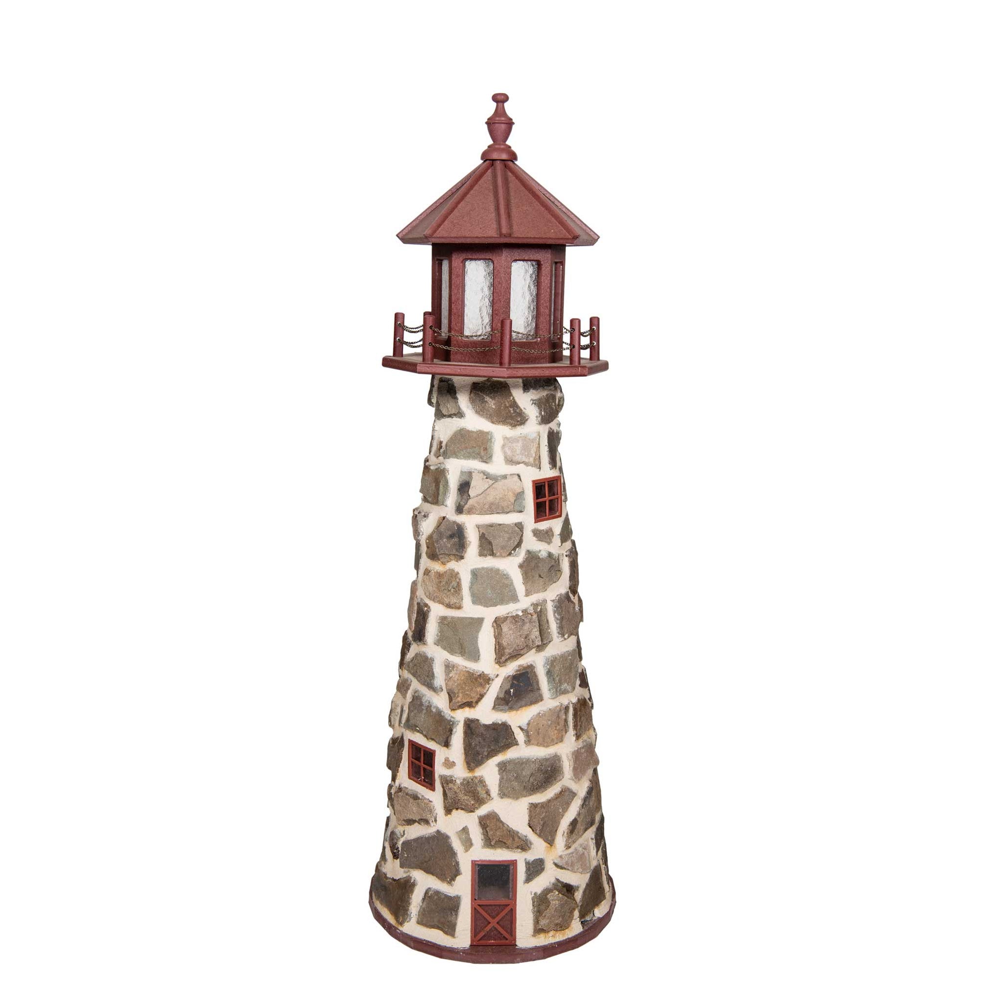 Amish 5' Stone Outdoor Decorative Lighthouse - Where it's Made: Lancaster, PAWhat it's Made Of: StoneShipping: Ships to all the lower 48 states!Assembly: Comes fully assembledExterior Size: 22"W x 60"H Interior Size: 16"W x 48"H (11"W at 2' High)