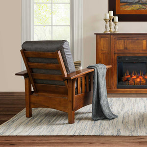 Una silla Morris tapizada construida para durar. Respaldo ajustable en 8 direcciones. Disponible en tela o piel. Amish Hecho a mano en el condado de Lancaster Elija sus opciones de madera, tinte y acabado Disponible en roble, arce, cerezo y roble blanco aserrado en cuartos.