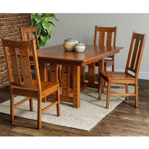 Our new Dixon Mission Trestle table features contrasting inlays in a stylish arts & crafts design. Shown with the Dixon Chair. Shown in Harvest Stain on Oak.