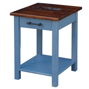 Mesa auxiliar Artesia Barnwood | Amish hecho a mano | Condado de Lancaster | Muebles de Snyder - Disponible en madera rústica de roble recuperada. Se muestra en azul Windsor con parte superior teñida de café. Hecho a mano en Pensilvania.