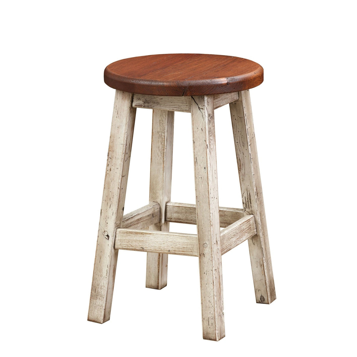 Taburete de bar Amish Barnwood | Condado de Lancaster PA | Muebles de Snyder - Disponible en madera rústica de roble recuperada. Se muestra en blanco con esmalte marrón Van Dyke - Asiento: Boston Hecho a mano en Pensilvania. 24" de alto, asiento redondo de 16", base de 19" Ver manchas El color principal es la base, el color de acento es el asiento