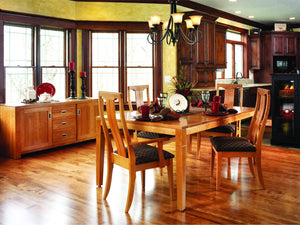 Silla de comedor Amish Brentwood de madera maciza - Se muestra con asientos de tela opcionales. #14340 Silla auxiliar Brentwood 19 3/4" de ancho x 42" de alto #14341 Sillón Brentwood 24" ancho x 42" alto Características estándar: asientos de madera Opciones: asientos de tela $ asientos de cuero $