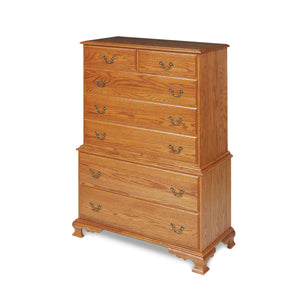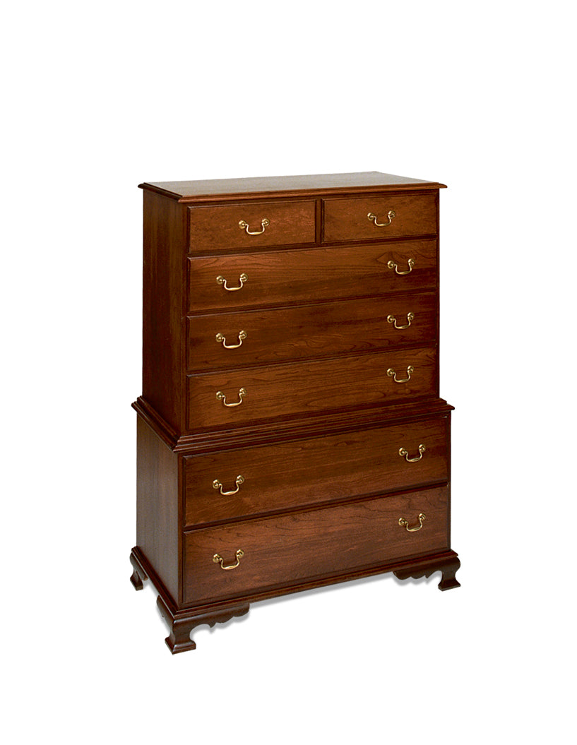 Cofre Jamestown en el cofre | Muebles Amish Lancaster PA - El cofre sobre cofre de Jamestown es uno de los favoritos desde hace mucho tiempo. Cuenta con "pies elegantes" curvos y tapas y cajones con bordes. Los cajones ocultos con cierre automático son estándar. A menudo se muestra en roble claro, pero también puedes hacerlo en cerezo oscuro para una apariencia más formal.