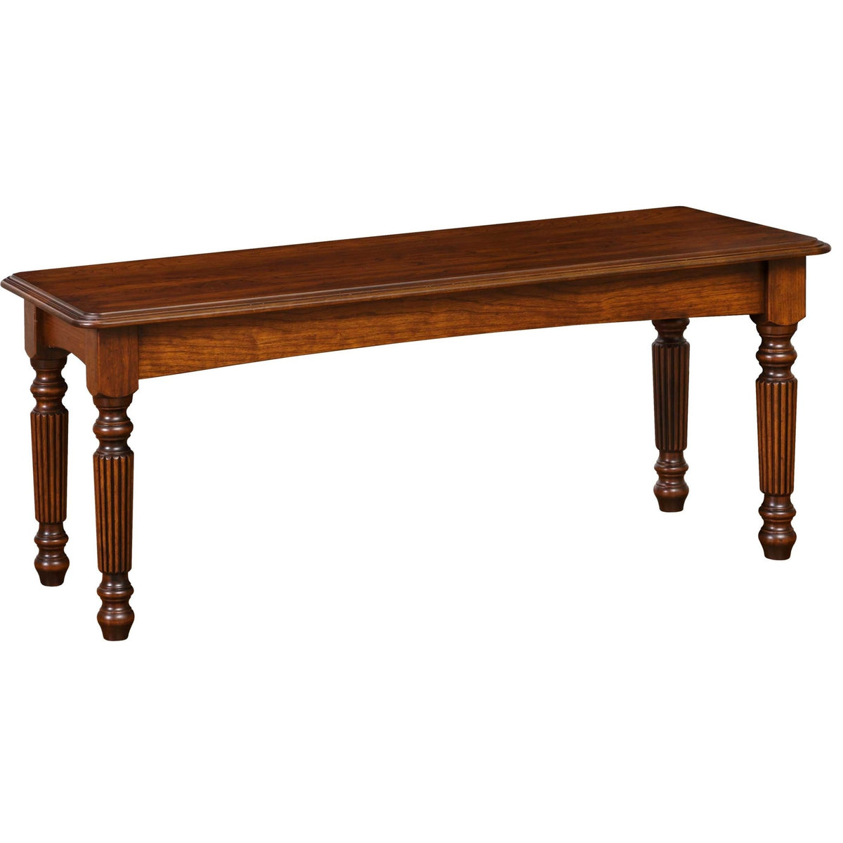 Banco Milán | Muebles Amish Lancaster PA - ¡El estilo más nuevo de la colección Olde Village Inn! Este banco Milano tiene patas estriadas y está hecho para sentarse frente a la cama con paneles. Hecho a mano por artesanos Amish con maderas duras sólidas del noreste. Se muestra en color Cerezo - Tinte Woodberry