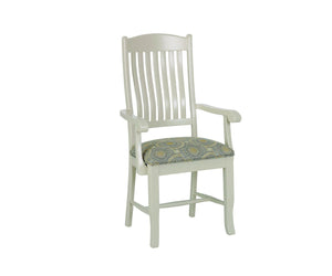 Silla de comedor Amish Monarch de madera maciza - Se muestra con asientos de tela opcionales. #11012 Silla lateral Monarca 19 1/2” ancho x 40 3/4” alto #11013 Sillón Monarca 23 1/2” ancho x 40 3/4” alto Características estándar: asientos de madera Opciones: asientos de tela $ asientos de cuero $