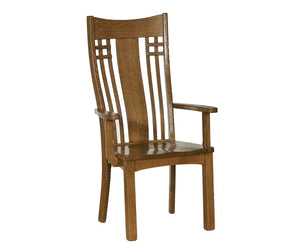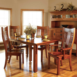 Silla de comedor Amish Monrovia de madera maciza - #12418 Silla auxiliar Monrovia 19 3/4" de ancho x 45" de alto #12419 Sillón Monrovia 24 1/2" de ancho x 45" de alto Características estándar: asientos de madera Opciones: asientos de tela $ asientos de cuero $