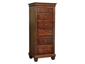 Cofre de lencería palatina de madera maciza Amish - 7X-4187: cofre de lencería Tamaño: 25" ancho x 19 1/2" profundidad x 59" alto Características: Hardware B143 Guías deslizantes para cajones de cierre suave y montaje inferior de extensión total