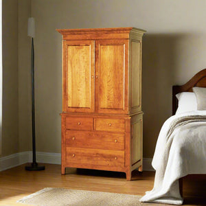 Este armario grande Shaker Windsor cuenta con 4 cajones con cierre automático encajados. Estantes regulables detrás de las puertas. Disponible en roble, cerezo y arce. Hecho a mano en Pensilvania. Se muestra en color Cereza - Otoño Trigo con perillas de madera. Viene en 2 piezas.