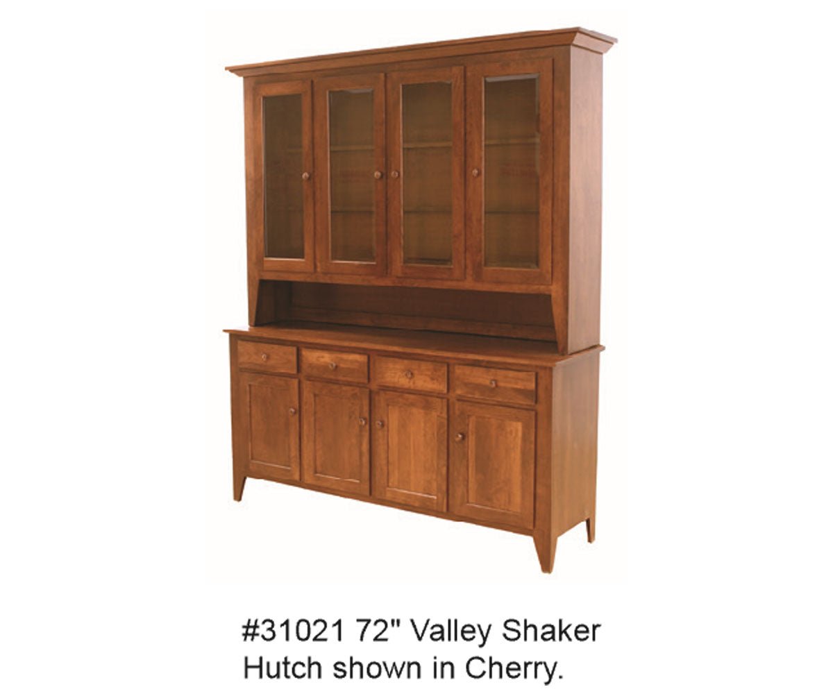 Conejera Amish de madera maciza Valley - Se muestra en color cereza con acabado S-14 (Nivel 1). #31020 Conejera tipo coctelera Valley de 62" de ancho x 19 3/8" de profundidad x 84" de alto Características estándar: vidrio biselado estantes de vidrio iluminación de tono táctil respaldo de madera lisa 1 estante fijo en buffet Hardware A006 (A) También disponibl