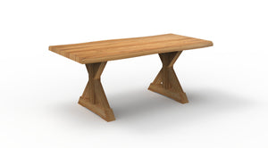 Mesa de comedor Bartholomew de teca de 72" con borde vivo - Natural - Producto exclusivo Carolina Live Edge. Llegando en marzo de 2024. Fabricado con tablones de teca maciza con borde vivo natural. Base de caballete en X hecha a mano de teca maciza con camilla. Dimensiones: 72" de largo x 36" de ancho x 30" de alto.