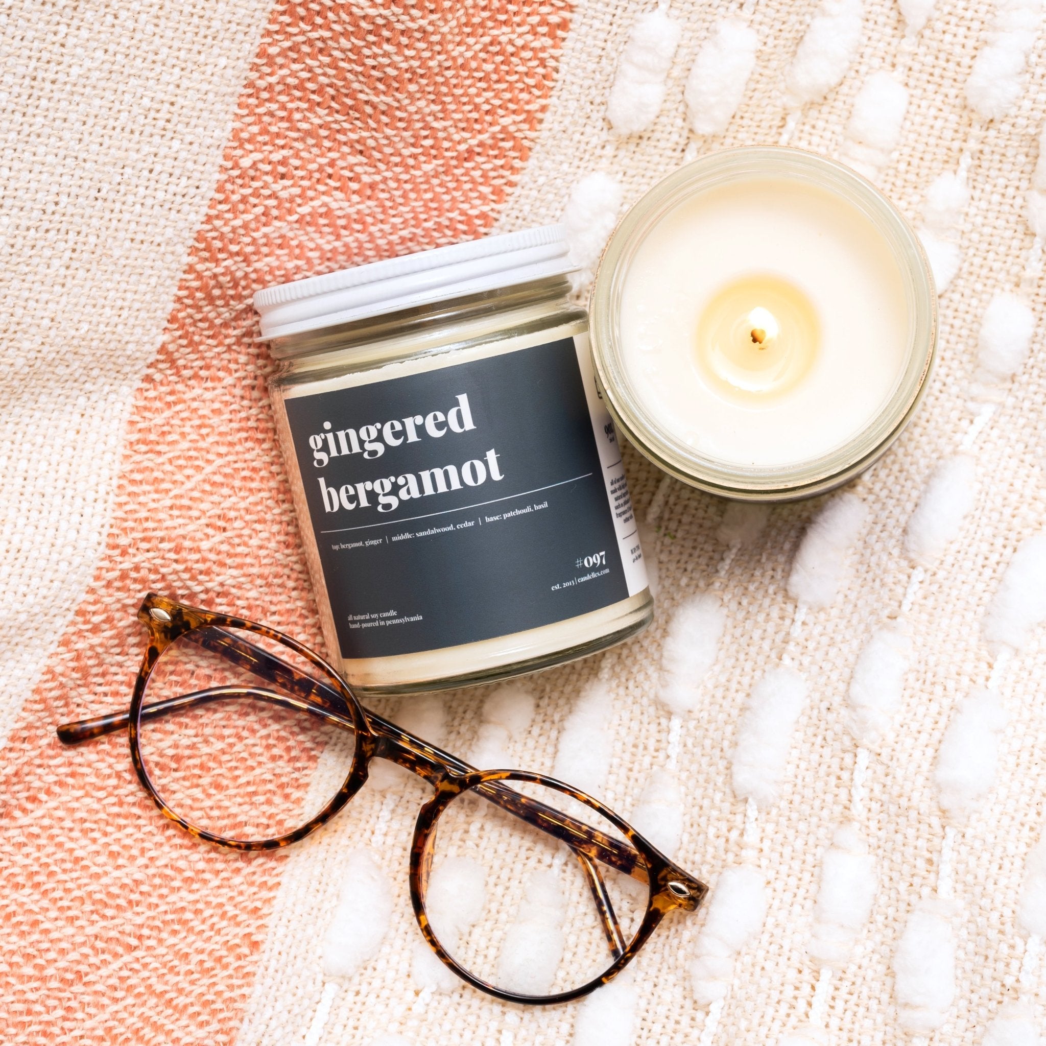 Vela de soja con bergamota y jengibre - Pequeña - Si le intriga una mezcla con mucho cuerpo, terrosa y herbácea, ¡nuestra bergamota con jengibre es la elección perfecta para usted! Tiene una excelente manta unisex que queda bien en casi cualquier habitación de tu hogar. NOTAS fragantes: arriba - bergamota, jengibre medio - sándalo, cedro base: pachulí, albahaca dulce