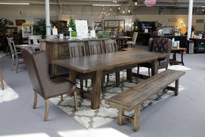 Set includes 2 arm chairs, 2 side chairs, and a roughsawn 68" bench as pictured.