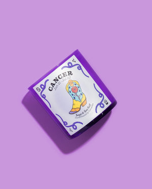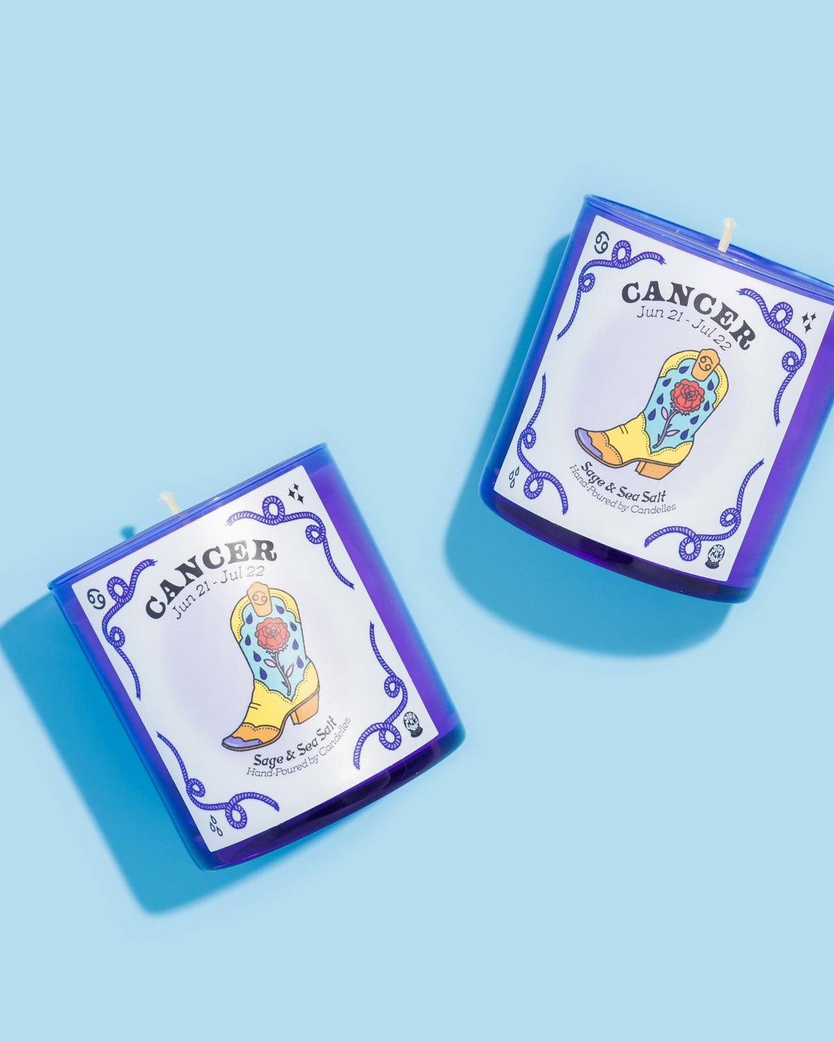 Esta vela fue curada por Candelles, combinando cada aroma con la personalidad del letrero. La obra de arte fue diseñada por Sara M. Lyon , basada en sus Zodiac Boots favoritas de los fanáticos. Una parte de todas las ventas irá directamente a Sara por sus increíbles talentos.