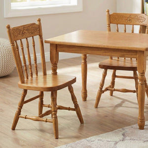 This Acornback Child's Amish Solid Wood Dining Chair is available in Oak or Cherry. Plain or Acorn Back. Acorn Back Design is pictured.