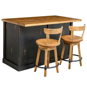 Amish 3 Door Rustic Trash Can Pullout Kitchen Island & Stool Set for 2 - Available in rustic Oak Reclaimed Barn wood. Set includes1 - 3 Door Rustic Kitchen Island2 - Perry Bar Stools Dimensions: 56″W x 35″D x 36″HBase Size: 54½”W x 26″D x 34½”H Shown With:Wood: Rough Sawn Wormy MapleStain: Clear with Van Dyke Brown GlazePaint: Black with Seely RubHardware: K92837-BK (pull) Features:• Doveta