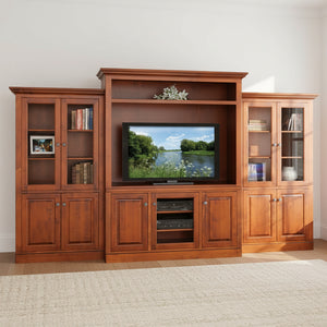 Amish 3pc 134" Wall Entertainment Center - Dimensions:Overall : 134" x 75"h x 19"dCenter: 60"W x 19"D x 75"H Side Tower: 37"W x 16"D x 68"H Side Tower Features: • Two adjustable shelves behind each set of doors Item Codes: Center: 282 Side Tower: 291 This design is available in an additional sizes: