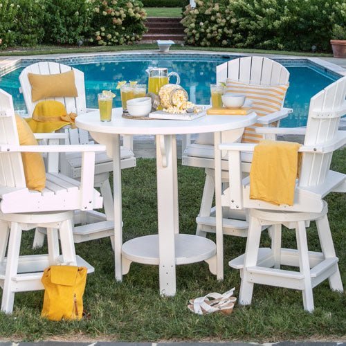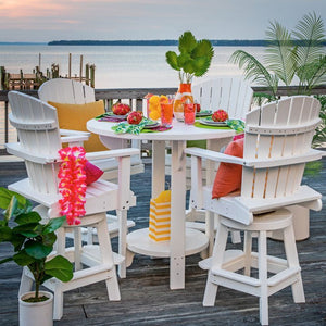 Amish Poly 42" Round Swivel Adirondack Bar Height Patio Table & Chair - Relax knowing your furniture is backed by a 20 Year Warranty, handmade by the Amish in Lancaster, PA using earth friendly recycled poly materials and stainless screws to enjoy for decades to come!Where it's Made: Lancaster, PASet Includes: 1 Table, 4 Swivel ChairsShown In: All White, (3rd Pic: Weatherwood w/ Black Trim