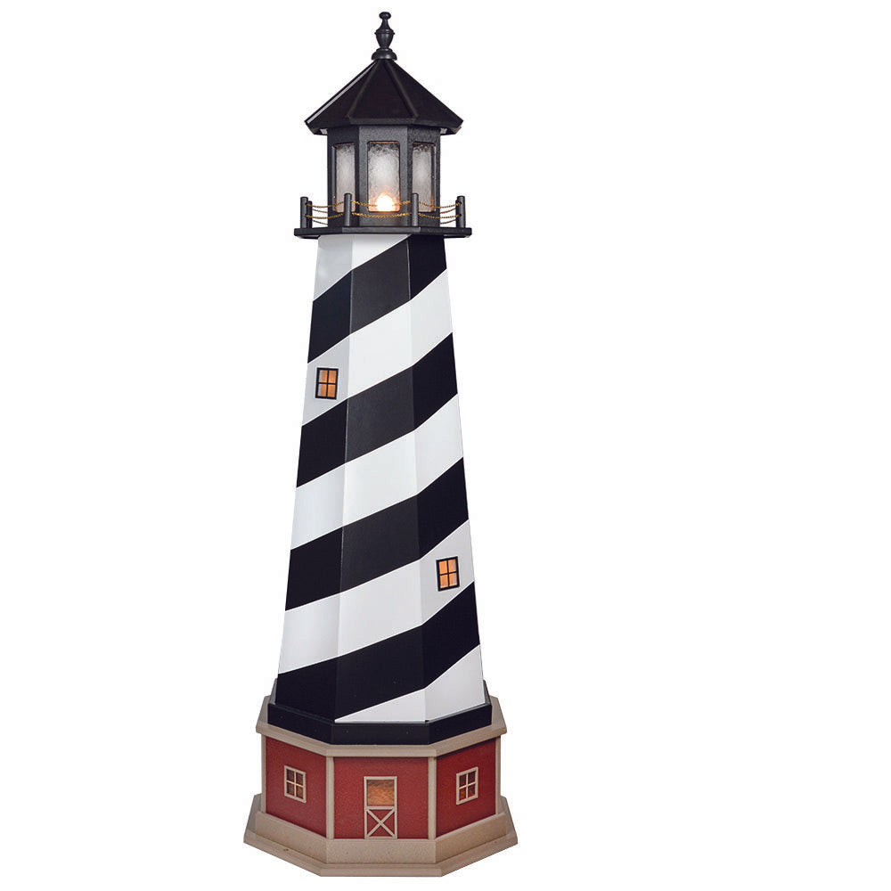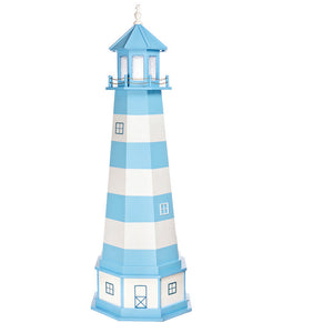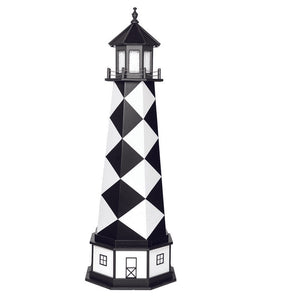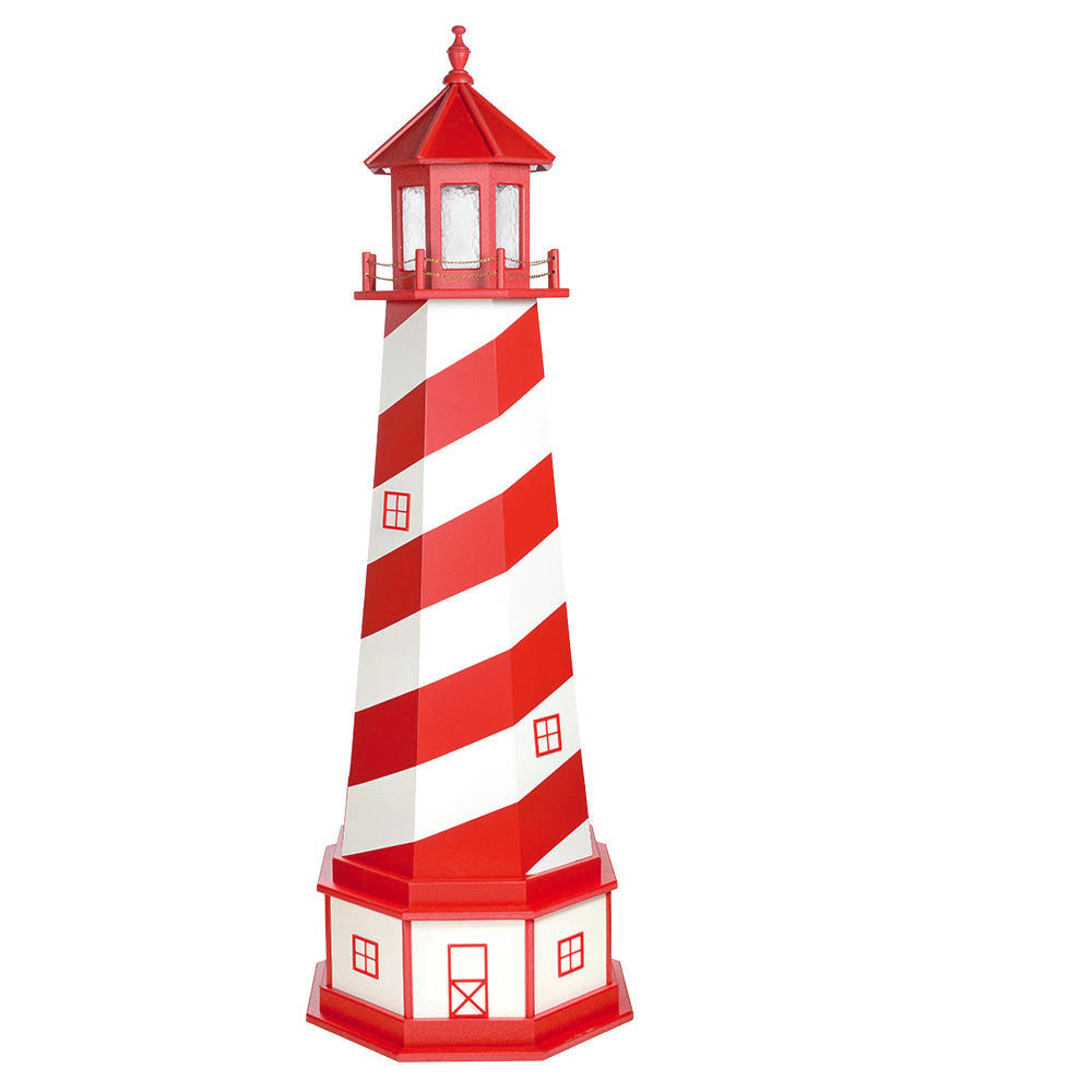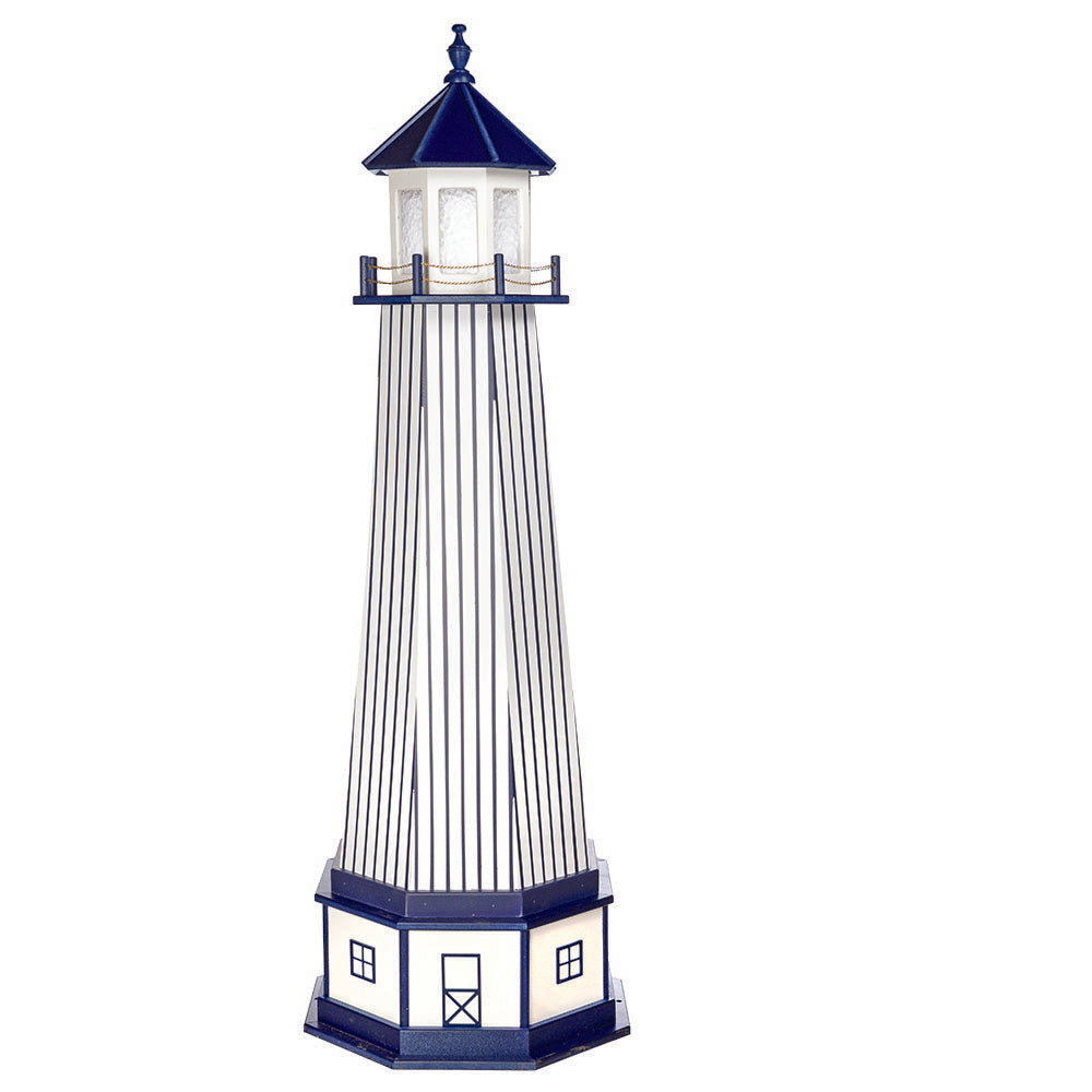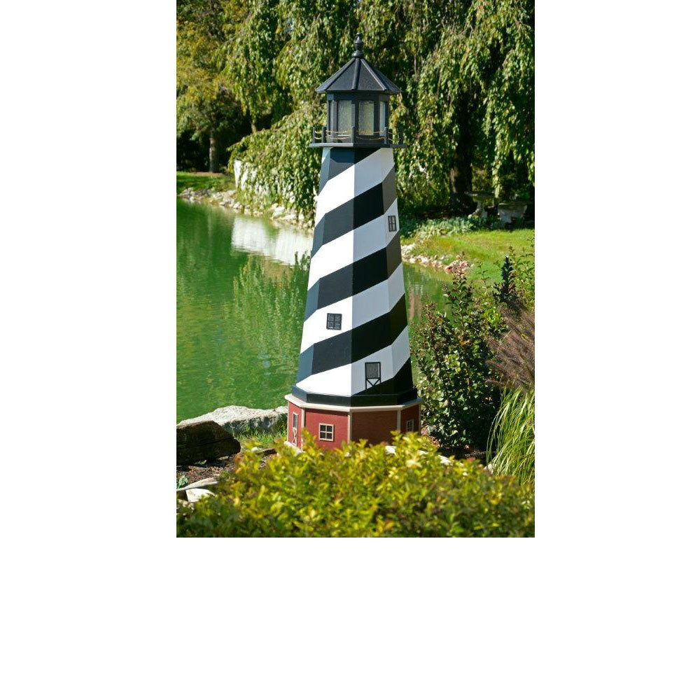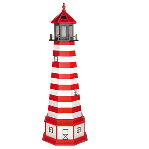 Amish 6' Wood Outdoor Decorative Lighthouse with base - Where it's Made: Lancaster, PAWhat it's Made Of: WoodShipping: Ships to all the lower 48 states!Assembly: Comes fully assembledExterior Size: 25"W x 72"H Interior Size: 20"W x 48"H (15"W at 2' High)Base Size: 27"W x 12"H (Overall 6'10"H)