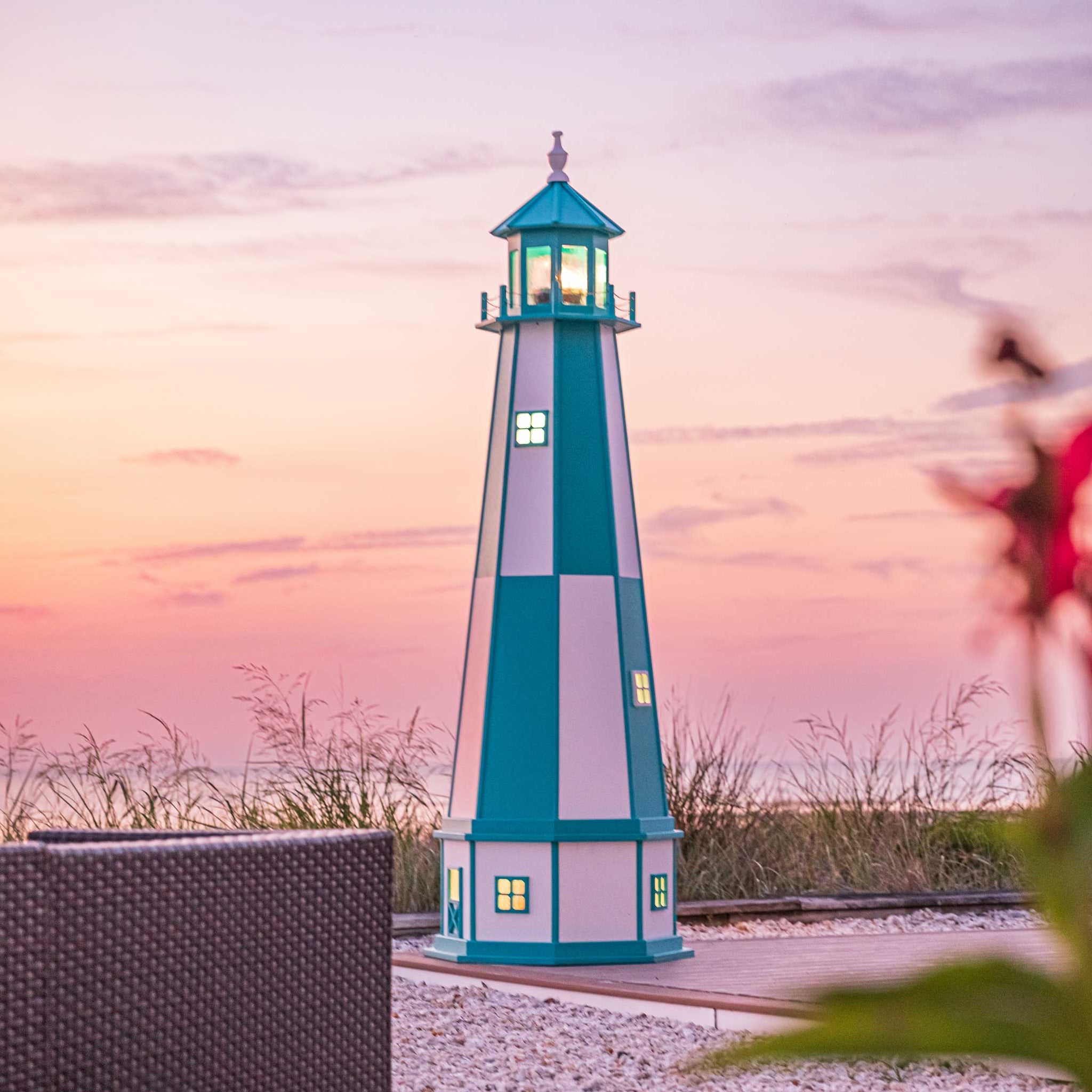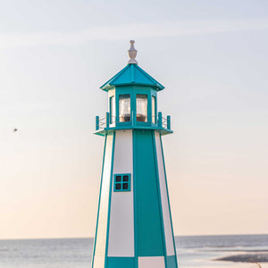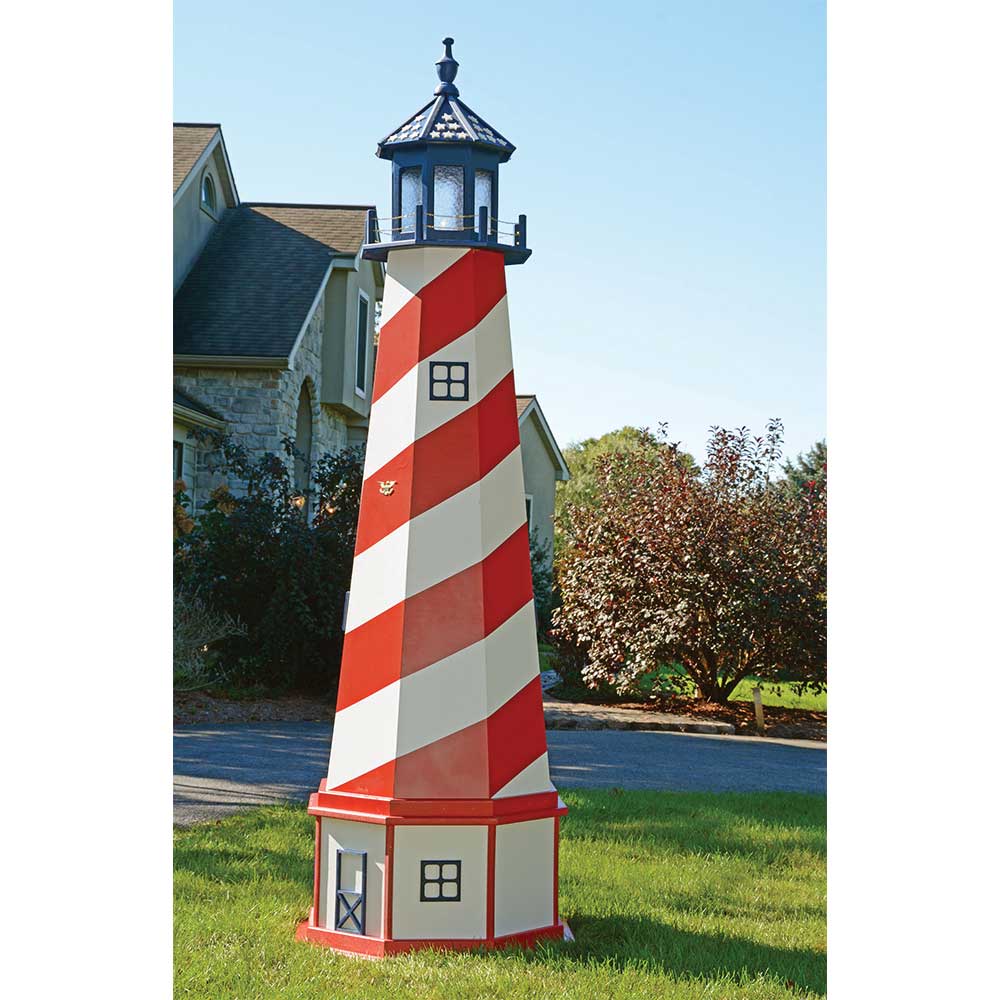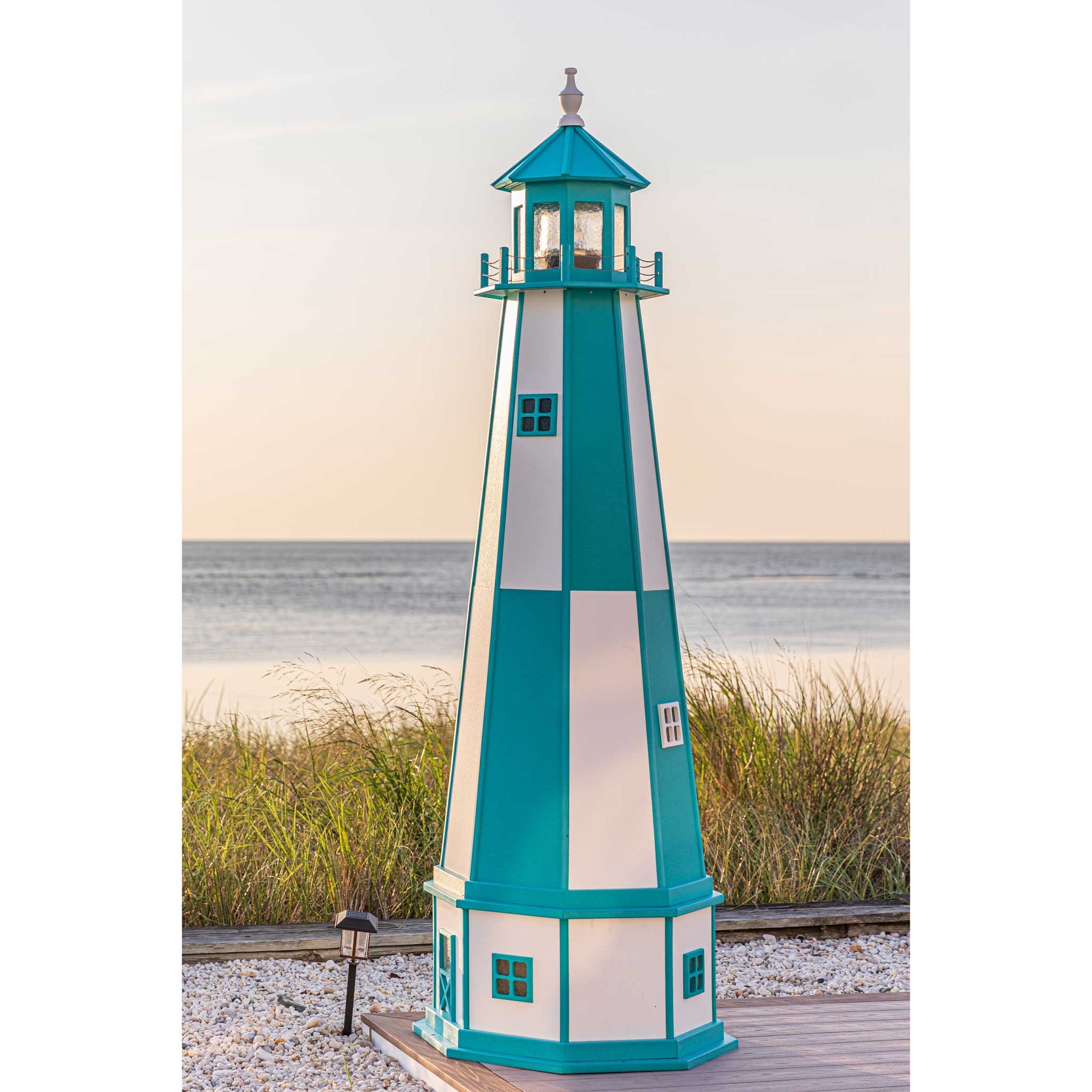 Amish 8' Poly Outdoor Decorative Lighthouse with base - Where it's Made: Lancaster, PAWhat it's Made Of: PolyShipping: Ships to all the lower 48 states!Assembly: Comes fully assembledExterior Size: 34"W x 96"H Interior Size: 28"W x 79"H (23"W at 2' High)Base Size: 36"W x 24"H (Overall 9'6")