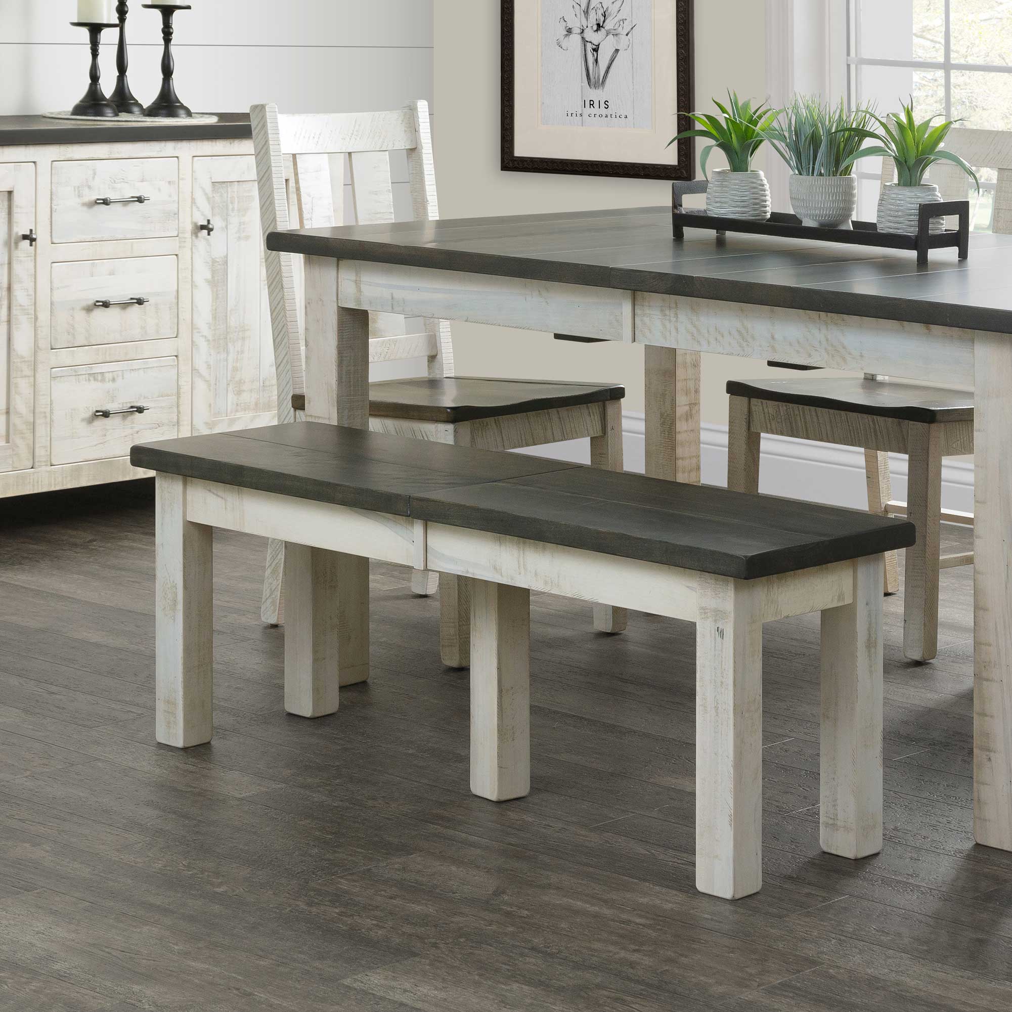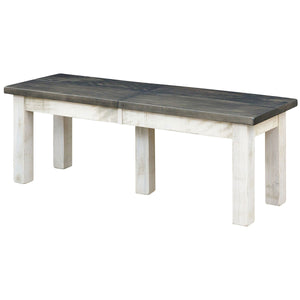 Amish Alamo Extension Dining Bench - Shown in Shown in Rough Sawn Wormy Maple / Top: Aged Mazing Walnut, Rest Aged Whitewash. Amish Handcrafted only miles from our store in Lancaster County, PA out of northeastern hardwoods! Limited Lifetime Warranty Available in Oak, Brown Maple, Cherry, Maple, Elm, Hickory, and Quartersawn Oak.