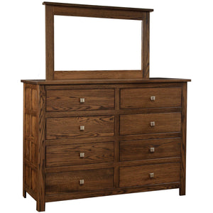 Amish Alto Solid Wood 62" 8 Drawer Dresser - Dimensions:Dresser: 62″W x 22¼”D x 46″HMirror: 50″W x 33″H Shown With:Wood: OakStain: CocoaHardware: 55273-G-10 Features:• Dovetailed drawers• Soft close full extension drawer slides Item Code:Dresser: 2433Mirror: 2438