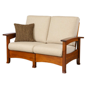 An upholstered Morris Loveseat built to last. Amish Handcrafted in Lancaster County Pick your wood, stain & finish options Available in Oak, Maple, Cherry & Quartersawn White Oak.