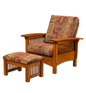 An upholstered Morris Chair built to last. Amish Handcrafted in Lancaster County Pick your wood, stain & finish options Available in Oak, Maple, Cherry & Quartersawn White Oak.