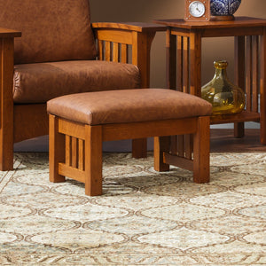 Amish Craftsman Wood Frame Ottoman - An upholstered Ottoman built to last. Amish Handcrafted in Lancaster County Pick your wood, stain & finish options Available in Oak, Maple, Cherry & Quartersawn White Oak. Amish Backed Warranty Water Resistant Finish View Stain & Finish OptionsView Fabric Options