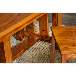 Our new Dixon Mission Trestle table features contrasting inlays in a stylish arts & crafts design. Shown with the Dixon Chair. Shown in Harvest Stain on Oak.