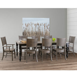 Amish Heartland Rustic Turned Leg Dining Table Set - Available in rustic Oak Reclaimed Barn wood. Set includes1 - 42"x 72" Heartland Leg Table with 2 - 12' Leaves6 - Wright Side Chairs2 - Wright Arm Chairs Shown in: Tops and Chairs - Smokey Gray w/ Black glaze / Table Legs - Black paintHandcrafted in Pennsylvania View StainsMain Color is Base, Accent Color is Top/Seat