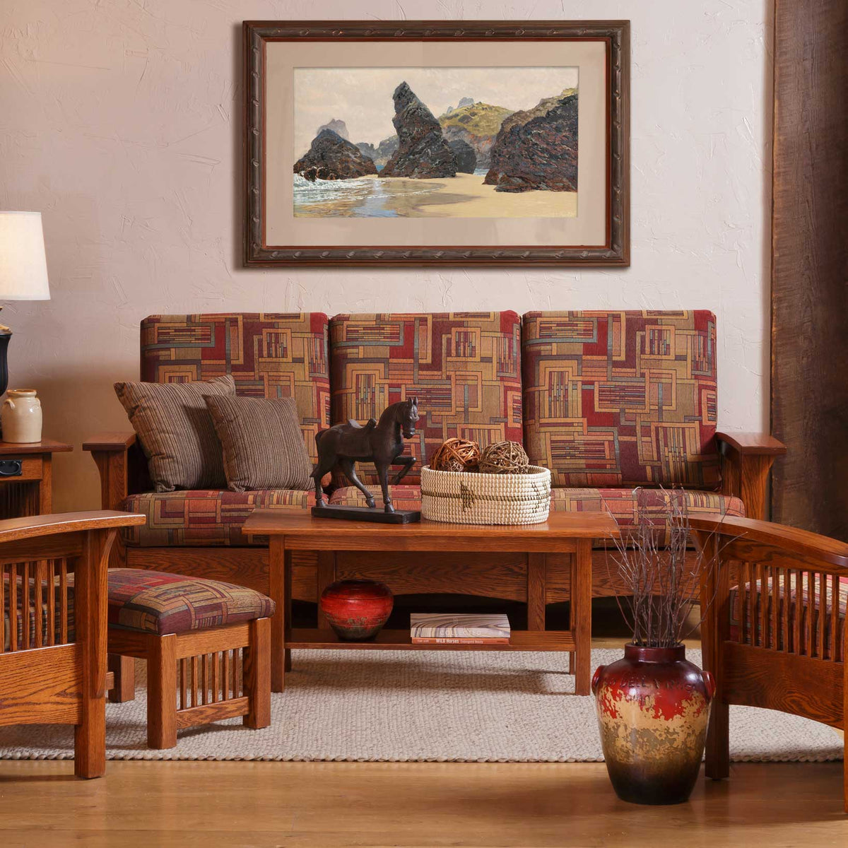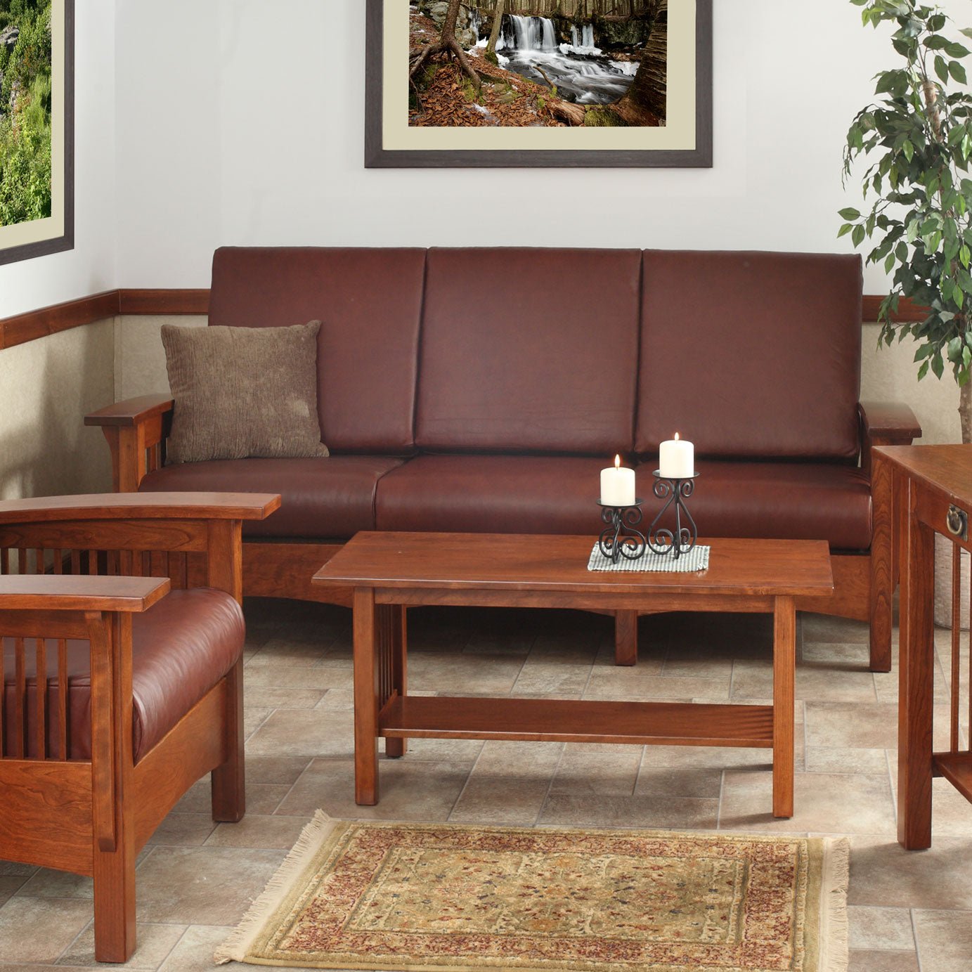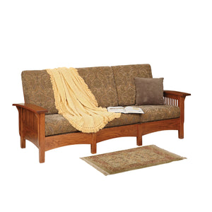 Amish Solid Wood Mission Morris Sofa - An upholstered Arts & Crafts style Morris Sofa built to last. Available in fabric or leather. Amish Handcrafted in Lancaster County Pick your wood, stain & finish options Available in Oak, Maple, Cherry & Quartersawn White Oak. Amish Backed Warranty Water Resistant Finish View Stain & Finish OptionsView