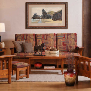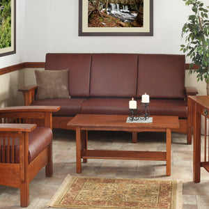 An upholstered Arts & Crafts style Morris Sofa built to last. Available in fabric or leather. Amish Handcrafted in Lancaster County Pick your wood, stain & finish options Available in Oak, Maple, Cherry & Quartersawn White Oak.