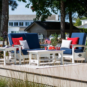 The standard in outdoor relaxation. Sink into the cushioned deep seating Love Seat and enjoy peaceful bliss. This Love Seat never rots, never rusts, and lasts forever. Recycled poly & Stainless steel construction. It doesn't get any better than this. And handcrafted just 5 miles from our store.
