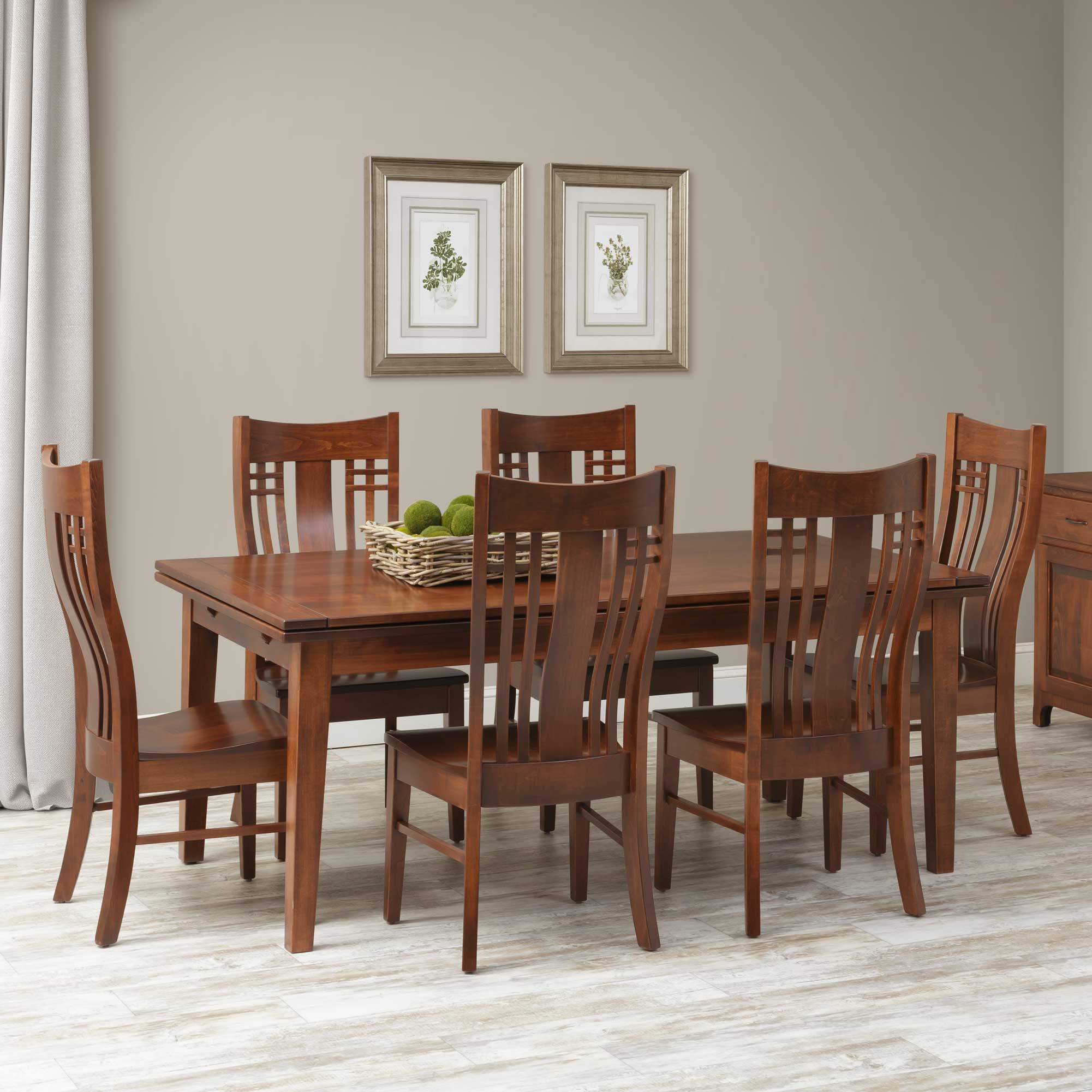 The Provence Draw Leaf Table is Amish Handcrafted only miles from our store in Lancaster County, PA out of northeastern hardwoods! This table features pull-out draw leaves in 12" or 18" leaves (depending on the size). The size listed is before the extensions are pulled out. The pullout leaves are rated at over 300 lbs per side. You can pick your leg style as well. Standard it comes with the Provence leg. Shown with the Bennett Chair and Shaker Leg in the room setting photo (Boston stain on Brown Maple). The white background photo features the Provence Leg in Micheals Aged Finish package on brown maple and the Plymouth Chair in distressed black. Chairs are sold separately.