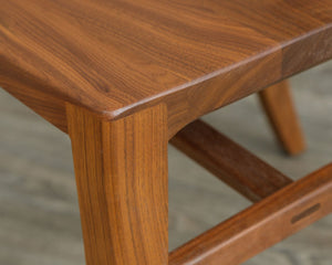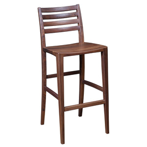This mid century modern Rettew bar stool with back is available in Cherry, Maple, & Walnut. This is built to order out of solid wood. Shown in Natural Walnut. Also available in dining height. Available in 24" counter height seat or 30" bar height seat.