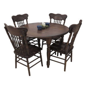 Amish Round Drop Leaf Table & 4 Pressback Chairs Set - Shown in Oak wood with a Lava stain the round drop leaf table from the Lebanon Valley. Combining Old World charm with Amish Craftsmanship. This round drop leaf table is handcrafted right here in Southern Pennsylvania. Available in solid wood oak, cherry or maple. Customize the size, wood, color, & finish to create