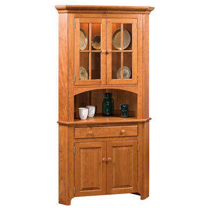 Amish Shaker 2 Door Corner Dining Storage Hutch - This Amish Shaker 2 Door Corner Dining Storage Hutchis available in Oak, Maple, or Cherry. Handcrafted by Amish craftsman out of solid northeastern hardwoods. There is no size customization on this product. bar lights and glass shelves with plate grooves One ¾ depth solid wood adj. shelf Dovetailed Drawer Dimmable LED