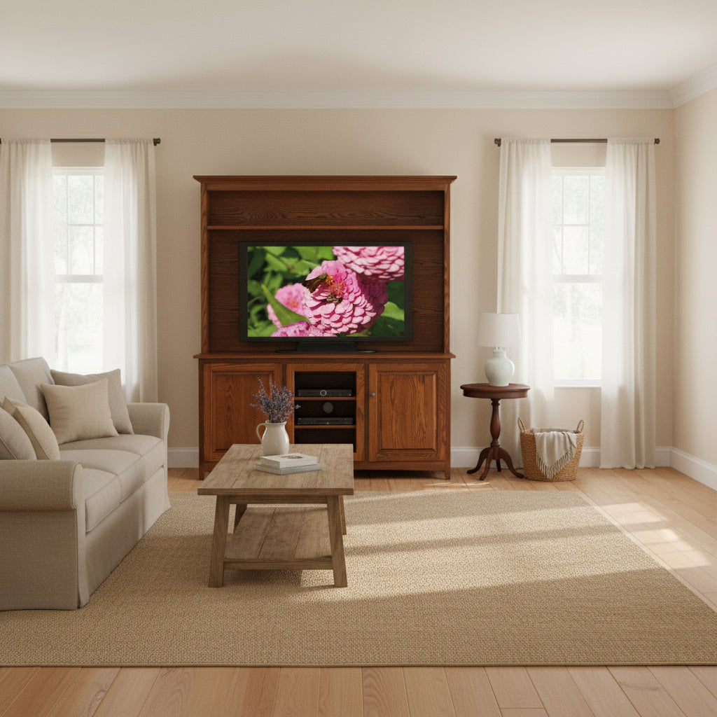 Amish Shaker 66" TV Stand with Hutch - TV Stand Dimensions: 66"W x 18"D x 32"H Hutch Dimensions: 68¾"W x 12½"D x 46"H Shown With: Wood: Oak Stain: Harvest Features: • Two adjustable shelves behind each door Item Codes: TV Stand: 6632-3D-S Hutch: 6646H-S