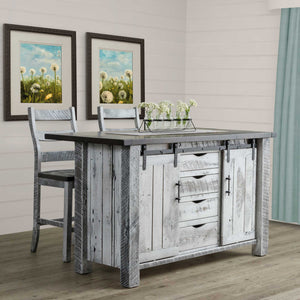 Amish Sliding Barn Door Rustic Kitchen Island & Stool Set for 2 - Available in rustic Oak Reclaimed Barn wood. Set includes1 - Sliding Door Rustic Kitchen Island2 - Raven Bar StoolsShown in: Tops and seats - Black stain / Rest: White w/ Black glazeHandcrafted in Pennsylvania View StainsMain Color is Base, Accent Color is Top/Seat