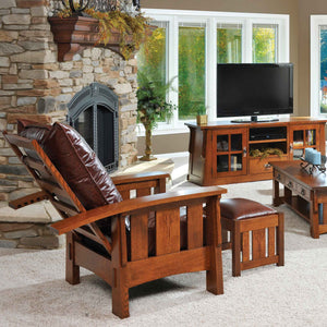 The Amish Solid Wood Alamosa Morris Chair is handcrafted in Ohio out of solid wood and quality fabric or leather.